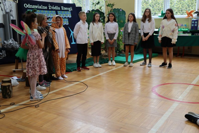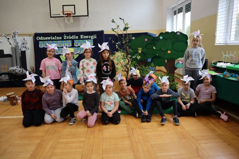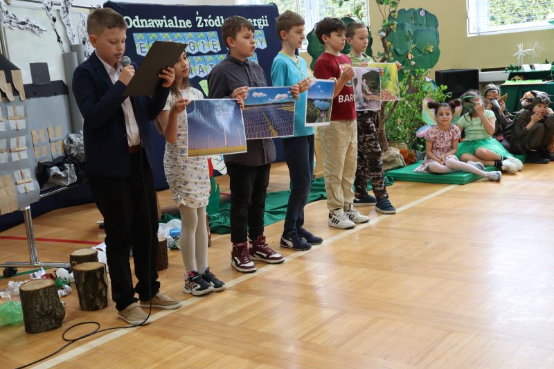 Tego zadania podjęły się w naszej szkole dzieci z pierwszej, trzeciej i czwartej klasy. Poprzez wiersze, rymowanki, piosenki oraz scenki w lesie i w mieście zaznaczyły rolę ochrony przyrody przez każdego z nas. Była to także świetna okazja do promocji działań w ramach projektu, w którym wzięła udział nasza szkoła - „Eko pracownia – zielone serce szkoły”. Uczniowie przedstawili zgromadzonym korzyści jakie płyną z alternatywnych i odnawialnych źródeł energii. Opowiedzieli także w jakiś sposób można wykorzystać OZE w domowym gospodarstwie. Akcję uświetniły ciekawe dekoracje zanieczyszczonego miasta i zielonego lasu oraz makiety przedstawiające ekologiczne gospodarstwa domowe z elementami OZE. Poza tym dzieci z klas młodszych i przedszkola miały na sobie opaski z emblematami odnawialnych źródeł energii : słońca, wiatru i wody. Pamiętajmy, że Ziemia to nasz dom i musimy o nią wspólnie dbać.