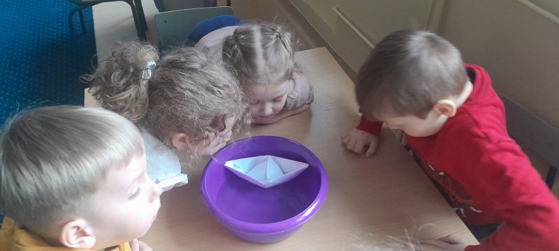Zadanie nr 13 – „Ł – jak łódki”. Ćwiczenie poprzedziło wykonanie łódek z papieru. Przygotowane łódki umieściliśmy na wodzie w miskach. Zadaniem dzieci było wprawianie ich w ruch za pomocą wydychanego powietrza.