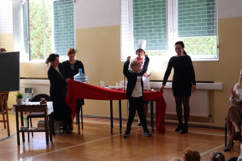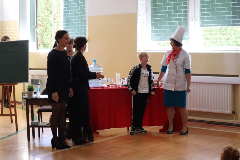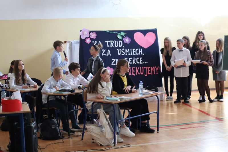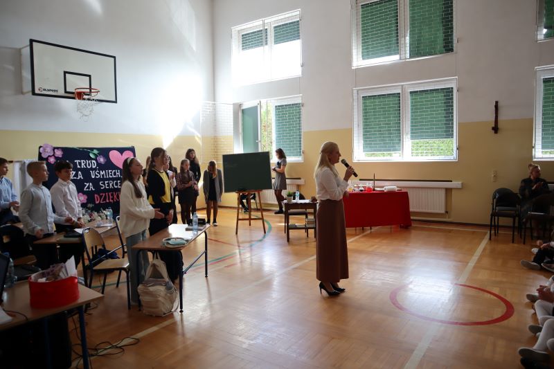 W części artystycznej dzieci i młodzież podziękowali nauczycielom za ich trud, cierpliwość, uśmiech, dobre serca i poświęcony czas. Słowami wierszy i piosenek wyrazili wdzięczność za ich codzienną pracę. Przedstawili też zabawne sytuacje z życia szkoły pt. „Parodia dnia szkolnego”, wcielając się w role nauczycieli i uczniów. W świetny nastrój wprowadziła wszystkich zebranych scenka z udziałem nauczycielek, które w dokładny sposób zaprezentowały „Przepis na ucznia”. Nie zabrakło uśmiechu i gromkich braw. Na zakończenie części artystycznej uczniowie zaśpiewali „Sto lat” i życzyli wszystkim: zdrowia, cierpliwości i wytrwałości. Przedstawiciele Samorządu Uczniowskiego, Rady Rodziców i Rady Sołeckiej wręczyli wszystkim pracownikom szkoły kwiaty. Po części oficjalnej Rada Rodziców zaprosiła pracowników szkoły i gości na wspólny poczęstunek, Dzień Edukacji Narodowej upłynął wszystkim w miłej i serdecznej atmosferze.