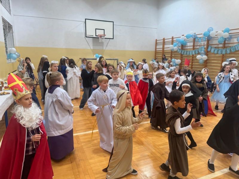 Dzieci pojawiły się w strojach nawiązujących do postaci świętych. Najpierw odbyła się modlitwa różańcowa w Kościele parafialnym, a potem cały orszak przemaszerował do szkoły, gdzie odbyła się dalsza część Balu. Były tańce i słodki poczęstunek. Dziękujemy Oratorium św. Dominika Savio w Twardogórze za animacje.
