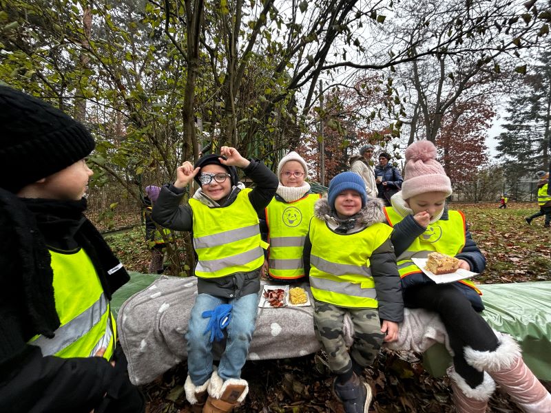 Pobyt w leśniczówce zakończył się tradycyjnym ogniskiem i pieczeniem kiełbasek. Na rodziców czekała gorąca kawa i ciasto drożdżowe upieczone przez naszą Panią Agnieszkę. Przedszkolaki z niezapomnianymi wrażeniami wróciły do placówki.