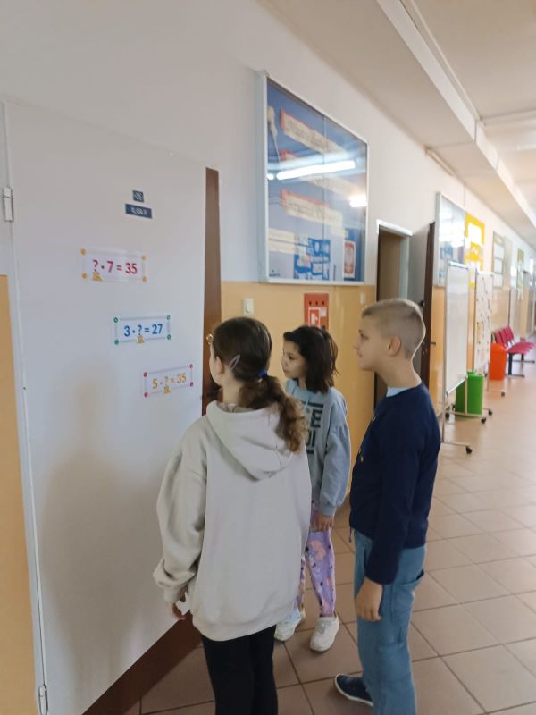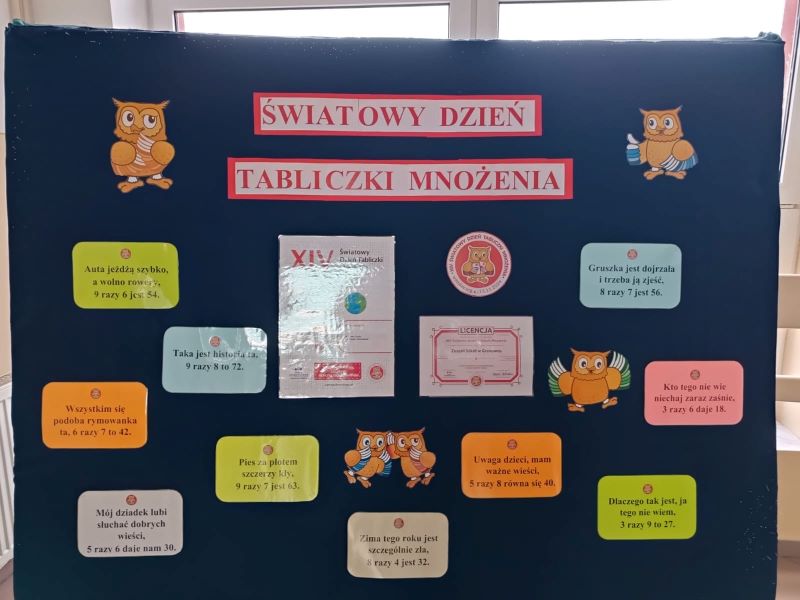 Już we wrześniu br. nasza szkoła po raz kolejny została zgłoszona do akcji World Multiplication Table Day i uzyskała certyfikat uczestnika. W tym roku święto to obchodzone było 15 listopada. Przygotowując się do obchodów XIV edycji Światowego Dnia Tabliczki Mnożenia, szkolne korytarze przyjęły odświętny wygląd. Na drzwiach sal lekcyjnych zawieszone zostały plansze z działaniami mnożenia i dzielenia. Pojawiła się gazetka informująca o wydarzeniu. Przedstawiała ona zabawne rymowanki, które pozwalały zapamiętać najtrudniejsze przykłady z tabliczki.