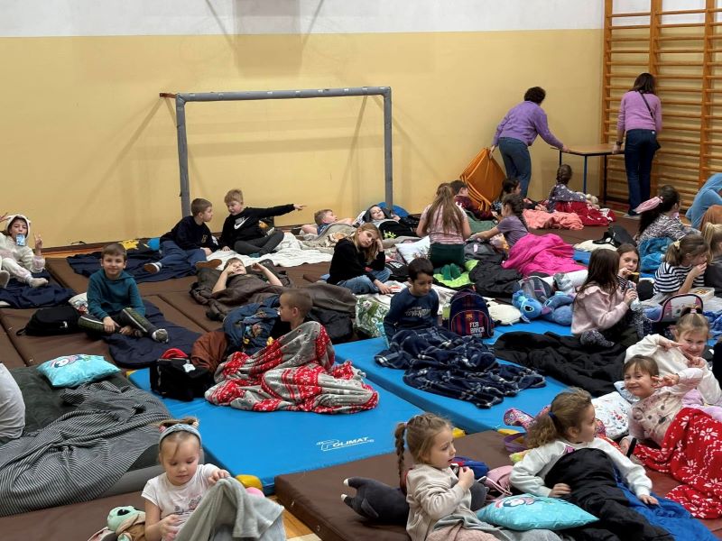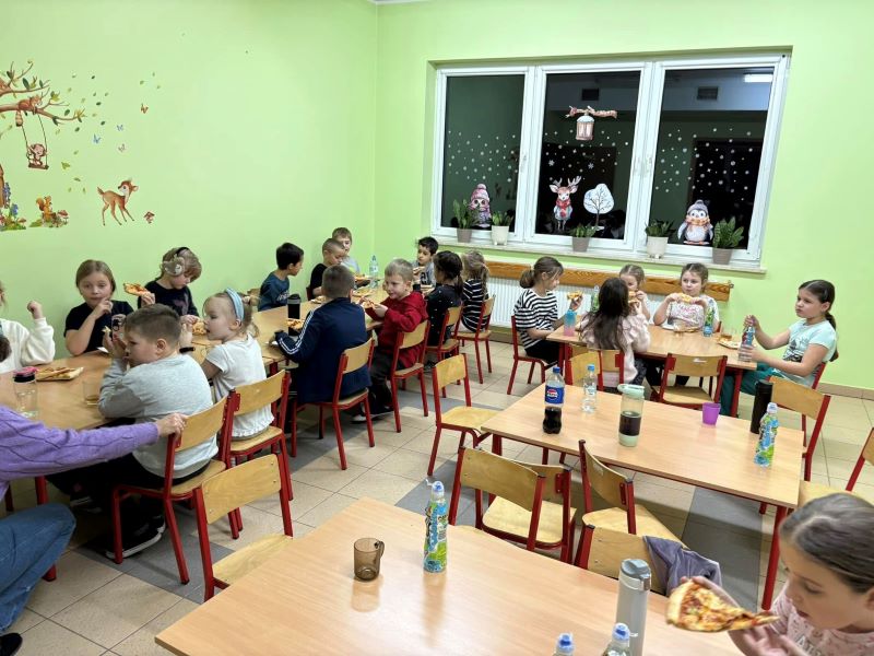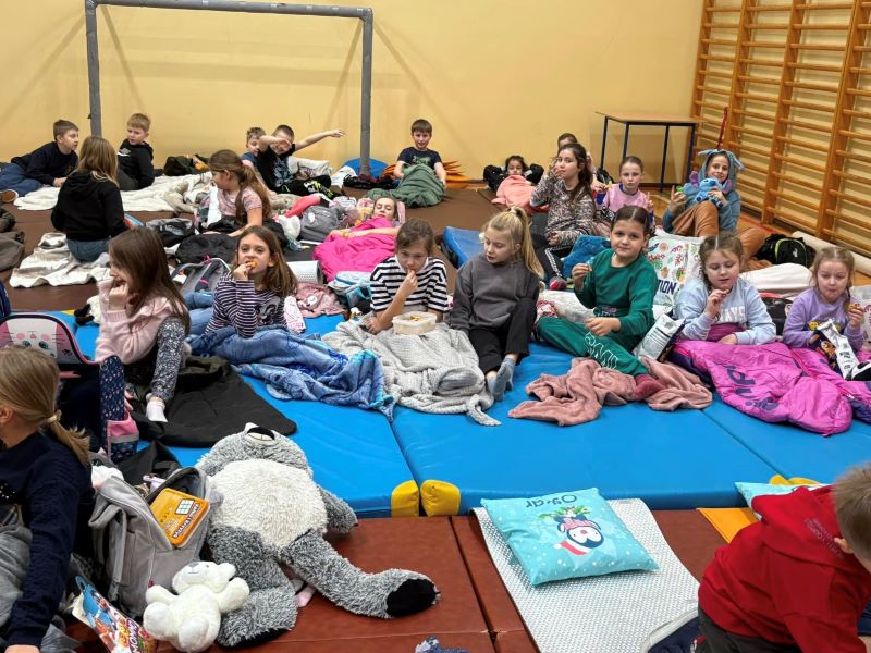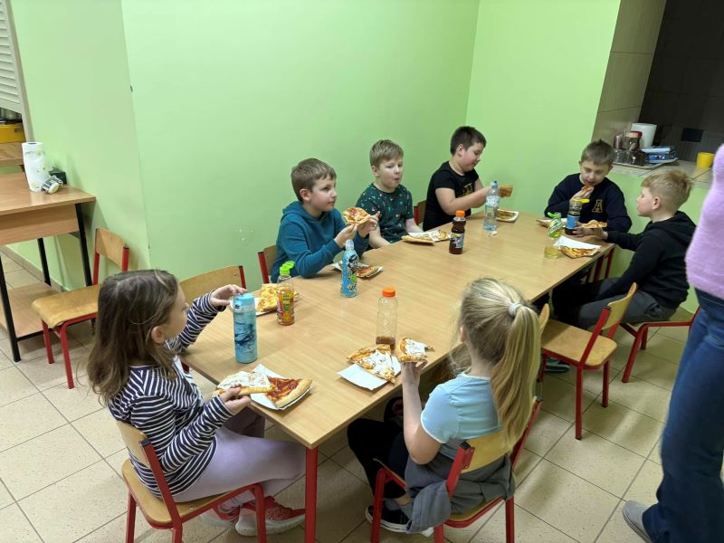 Na wygodnych materacach, zaopatrzeni w śpiwory, poduszki i koce z zainteresowaniem obejrzeli dwie animowane bajki „Tamte święta” i „Garfield”. W przerwie pomiędzy oglądanymi filmami dzieci zajadały pyszną pizzę. Było to dla nich nowe doświadczenie i niecodzienne przeżycie. Postanowiliśmy powtórzyć takie spotkanie w następne ferie.