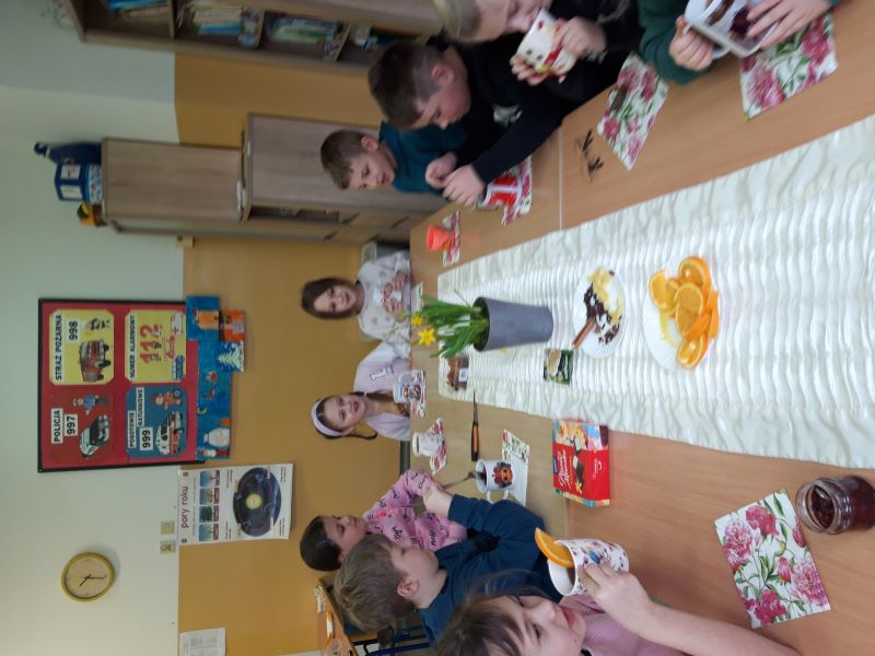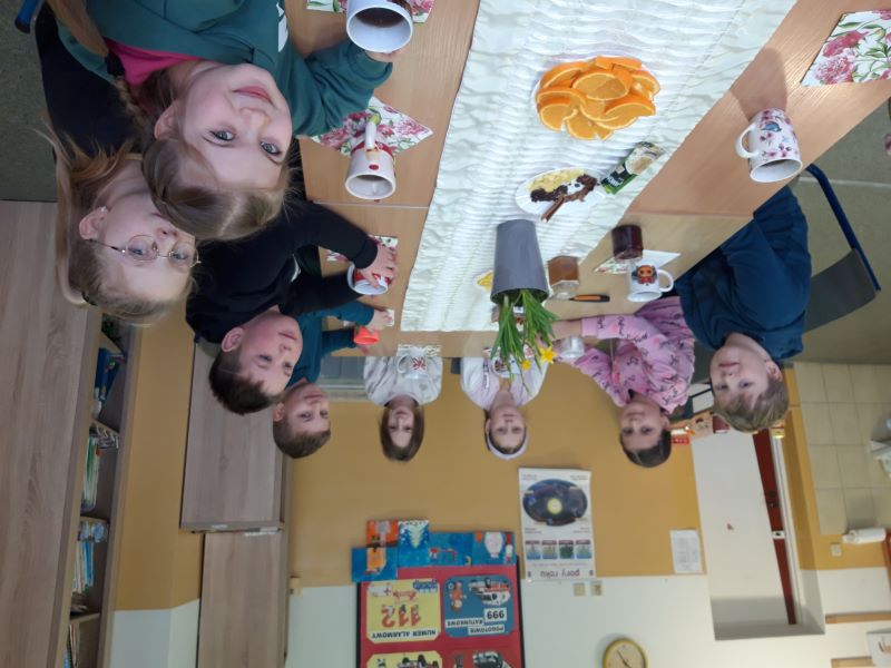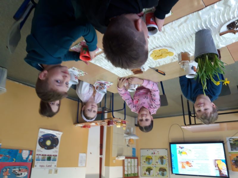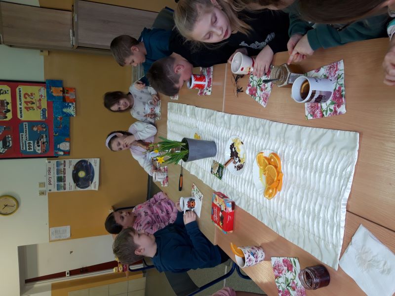 Miło i przyjemnie spędzili czas przy wspólnej herbatce uczniowie klasy II realizując temat dnia: ”Jak przygotować zimową herbatkę?” Do wybranej przez siebie herbaty dodawali według upodobań smakowych: miód, sok malinowy, świeży imbir, pomarańczę, cytrynę, goździki, cynamon, kardamon, anyż i komponowali rozgrzewającą „zimową herbatkę”. Przy okazji dowiedzieli się jakie wartości oraz jaki wpływ na nasze zdrowie i odporność posiadają te cenne dodatki. Uczniowie chętnie dzielili się zwyczajami picia herbaty w ich rodzinach oraz ulubionymi rodzajami tego wyśmienitego napoju.