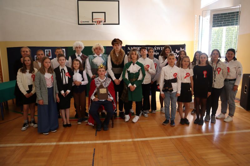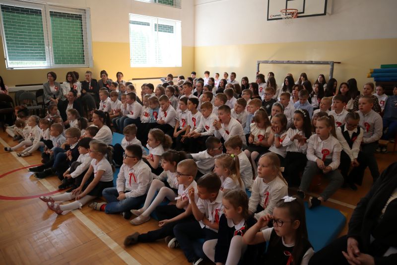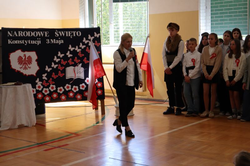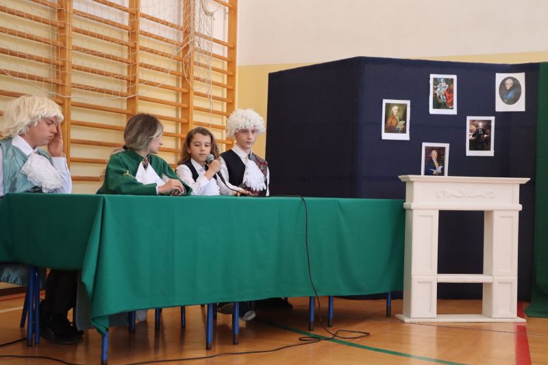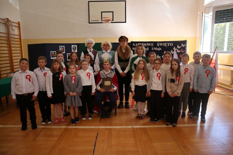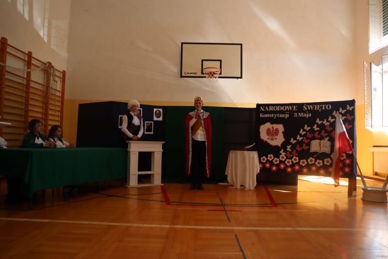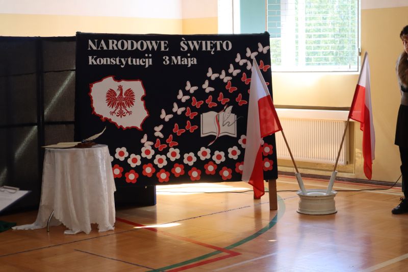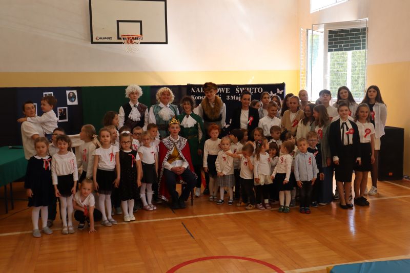 Jej celem było kształtowanie wśród uczniów poczucia przynależności narodowej. Część artystyczna rozpoczęła się od wprowadzenia sztandaru i odśpiewania hymnu państwowego. Społeczność szkolna wysłuchała montażu słowno – muzycznego oraz obejrzała scenkę historyczną nawiązującą do obrad Sejmu Czteroletniego i momentu uchwalenia Konstytucji 3 Maja. Uczniowie z pełnym zaangażowaniem wcielili się w role posłów, mieszkańców Warszawy, Marszałka Sejmu Rzeczypospolitej Polskiej - Stanisława Małachowskiego oraz króla Stanisława Augusta Poniatowskiego. Ta wyjątkowa lekcja historii skłoniła zgromadzonych do refleksji nad tym, że Ojczyzna jest naszym wspólnym dobrem, a Konstytucja 3 Maja była potwierdzeniem tej idei. Podniosły i patriotyczny charakter uroczystości podkreśliły odświętne stroje i biało-czerwone kotyliony uczniów, przedszkolaków i nauczycieli.