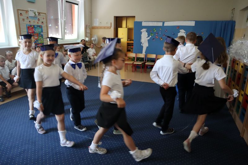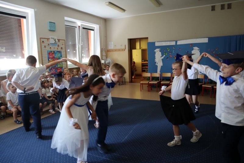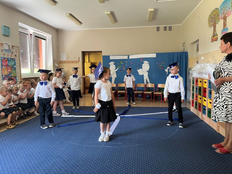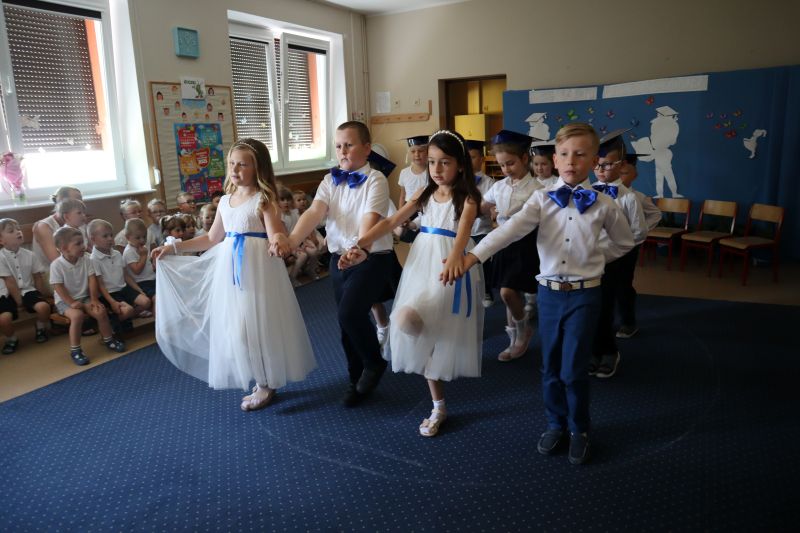 Dzieci zaprezentowały program artystyczny, na który składał się taniec -polonez, wiersze i piosenki, przygotowane specjalnie na tę okazję. Wzruszeni rodzice i nauczyciele nie kryli łez, oglądając występy swoich małych artystów. Dzieci z grupy „ Rybek” również sprawiły niespodziankę starszym kolegom, recytując krótkie wierszyki. Pani Dyrektor oraz wychowawczyni wręczyły pamiątkowe dyplomy i drobne upominki, dziękując za wspólnie spędzony czas i życząc im sukcesów w szkole Na uroczystość przybyli również przedstawiciele Rady Rodziców Przedszkola , którzy także obdarowali wszystkie przedszkolaki drobnymi upominkami. Uroczystość zakończyła się wspólną sesją zdjęciową i słodkim poczęstunkiem. Wszystkim absolwentom życzymy powodzenia na nowej drodze obowiązków szkolnych!