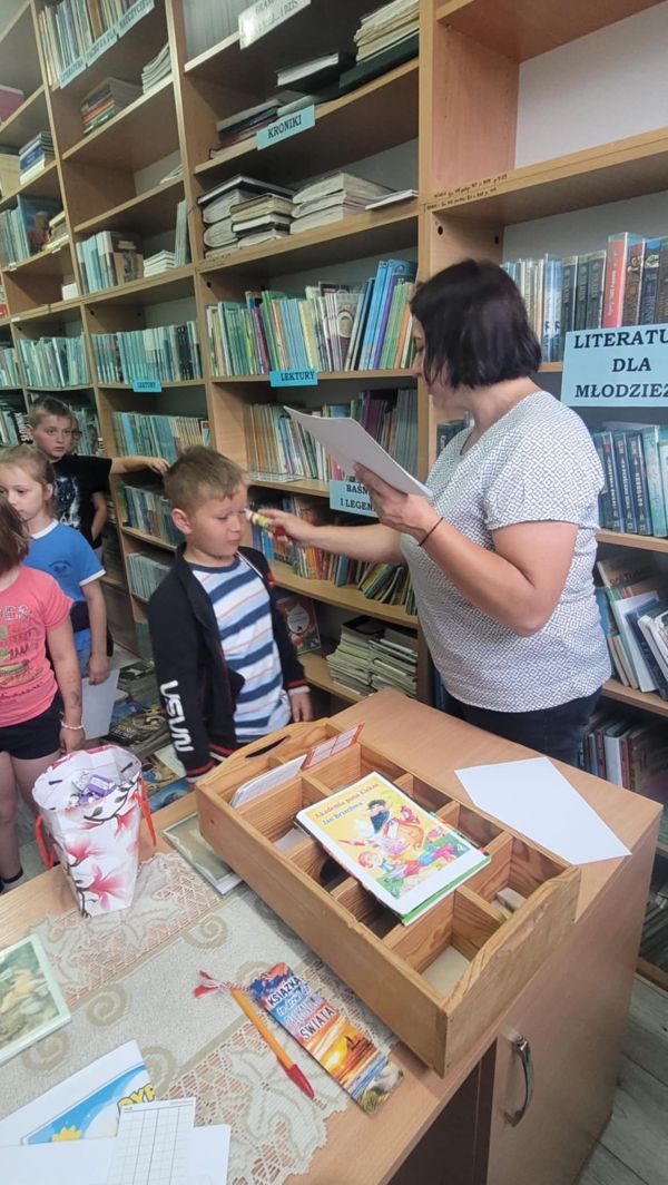 Pani bibliotekarka – Justyna Merta przypomniała zasady wypożyczania książek. Pokazała uczniom kartę książki, kartę czytelnika, zakładkę do książki. Pierwszoklasiści poznali również „Prośby książek” oraz „10 wskazówek dla czytelnika”. Wykazali się wiedzą na temat prawidłowego zachowania się w bibliotece oraz szanowania książek.