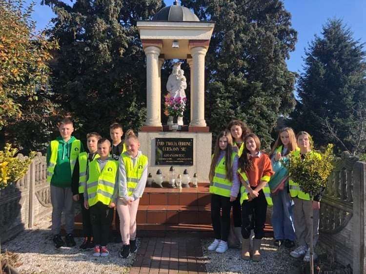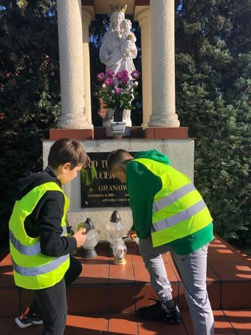 Włączyli się w akcję edukacyjno – społeczną Ministerstwa Edukacji i Nauki „Szkoła pamięta”. W ramach akcji wybrali się na cmentarz parafialny, zadbali o groby wieloletniego proboszcza – ks. Stefana Kuhna oraz nauczycielki – Pani Katarzyny Grzesiak, zapalili tam też znicze. Pod tablicą przy kościele, upamiętniającą ofiary II wojny światowej zapalili znicze, uczcili minutą ciszy pamięć poległych mieszkańców Granowca. Ponadto złożyli także znicze pod tablicą upamiętniającą błogosławioną Marię Gwidonę, siostrę zakonną pochodzącą z Granowca, która zginęła śmiercią męczeńską. W celu podnoszenia świadomości dzieci oraz ich wrażliwości na tradycje i historię naszej małej ojczyzny w przedszkolu przygotowano gazetkę ścienną poświęconą powstańcom wielkopolskim. Uczniowie klas 1-3 na zajęciach edukacji plastycznej oraz klas 4-8 na religii wykonali także prace plastyczne odwołujące się do tradycji świąt zadusznych. Na lekcjach informatyki uczniowie wykonali kartki okolicznościowe „Bohaterom za miłość do ojczyzny” z wykorzystaniem nowoczesnych technologii. Najstarsi uczniowie naszej szkoły wybrali się z wychowawczynią na cmentarz ewangelicki w naszej miejscowości, gdzie zagrabili liście i uporządkowali groby. Klasa 5 złożyła hołd Powstańcom Wielkopolskim z Granowca składając znicze przy Kapliczce Powstańców.