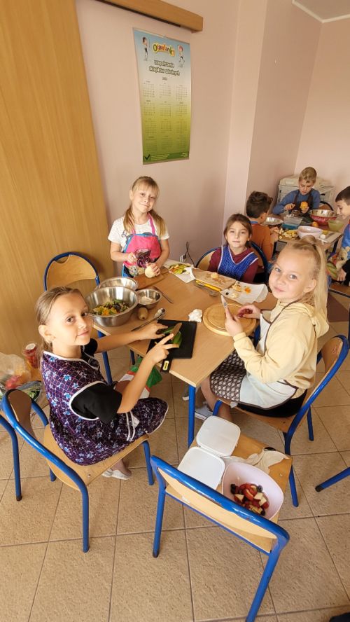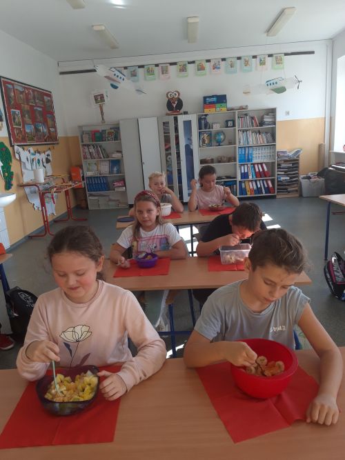 Uczniowie klas I - III przygotowali z ulubionych owoców pyszne sałatki, które zajadali z apetytem. Klasy II i III wybrały się w teren na podchody.