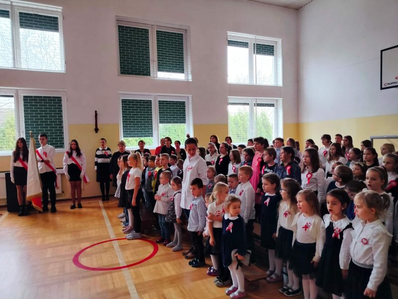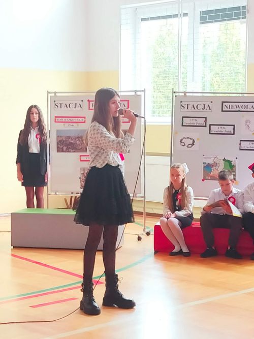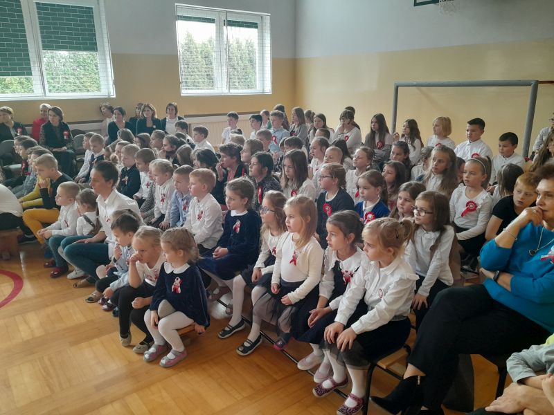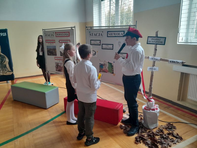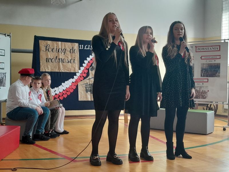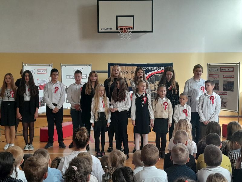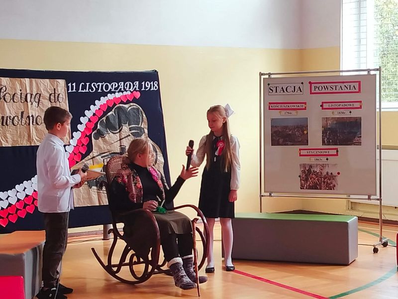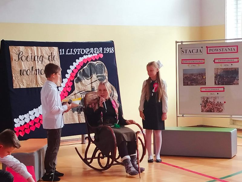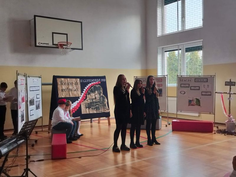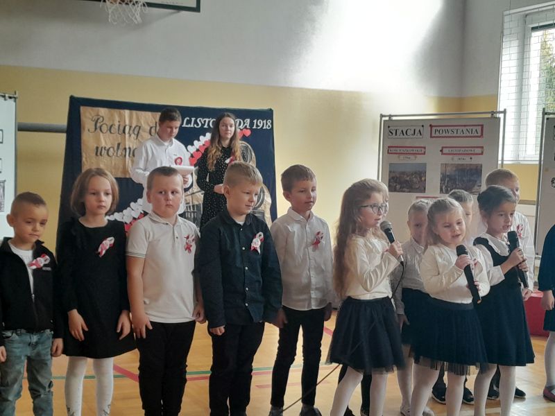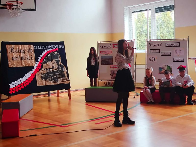 Uroczystość rozpoczęła się odśpiewaniem hymnu państwowego przez całą społeczność szkolną, która tego dnia, strojem podkreśliła wagę obchodów Dnia Niepodległości. Następnie „Pociąg” ruszył do czterech stacji: Niewola, Powstania, I Wojna Światowa oraz Wolność. Na stacjach uczniowie zapoznali się z historią Polski od momentu I rozbioru w 1772 r., aż do odzyskania po 123 latach wolności, w roku 1918. Inscenizacja przeplatana była patriotycznymi wierszami i piosenkami w wykonaniu uczniów. Wzruszającym momentem był występ przedszkolaków, którzy zaśpiewali piosenkę „Co to jest niepodległość?”.