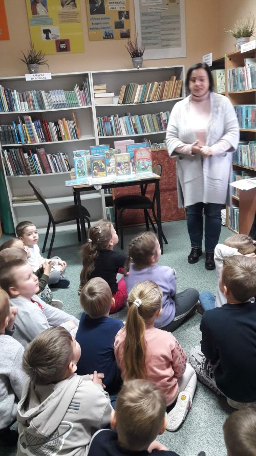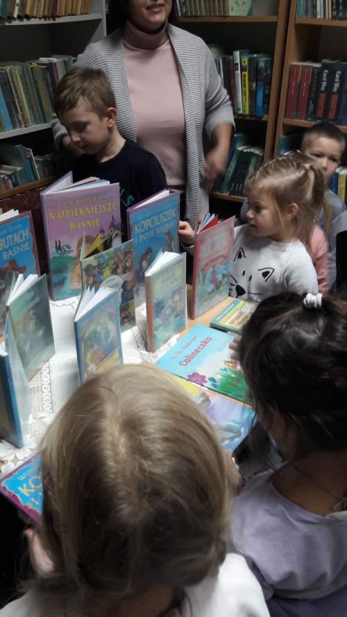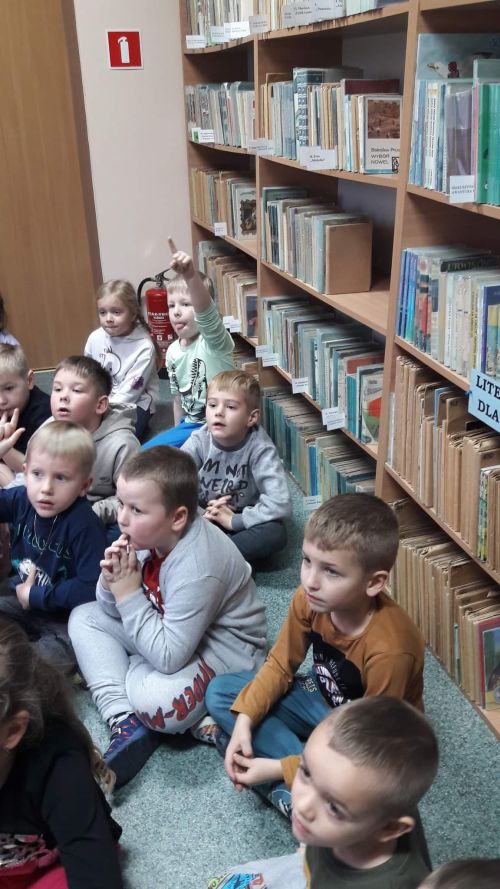 Celem ich wizyty było poznanie biblioteki oraz pracy bibliotekarza. Spotkanie rozpoczęło się od pogadanki. Pani bibliotekarka – Justyna Merta opowiedziała przedszkolakom o księgozbiorze bibliotecznym. Przypomniała, co należy zrobić, aby stać się czytelnikiem biblioteki i jak wypożyczać książki. Omówiła budowę książki i pokazała, jak naprawić zniszczoną książkę. Grupa starszaków dowiedziała się, jak wygląda zakładka do książki, karta książki i karta czytelnika. Przedszkolaki chętnie zgłaszali się i odpowiadali na pytania bibliotekarza. Wykazali się wiedzą na temat prawidłowego zachowania się w bibliotece oraz szanowania książek. Pani bibliotekarka zaprezentowała najpopularniejsze baśnie i bajki. Dzieci przeglądały książki. Opowiadały o tych, które znają i które mają w swojej domowej biblioteczce. Rozwiązywały zagadki o tematyce baśniowej.