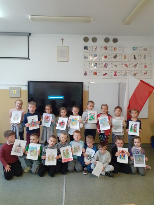 Klasy I-III również obejrzały przedstawienie Niebajka. Uczestniczyły w pogadance na temat patriotyzmu i bohaterstwa Powstańców. Wykonały pocztówki z życzeniami, a także rysunki przedstawiające bohaterską walkę Powstańców.