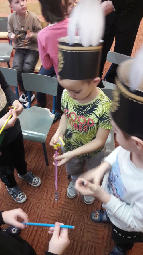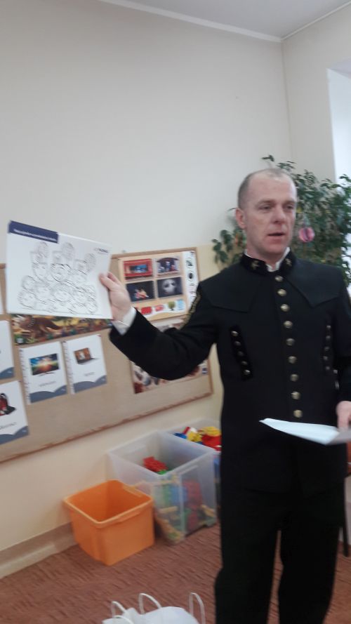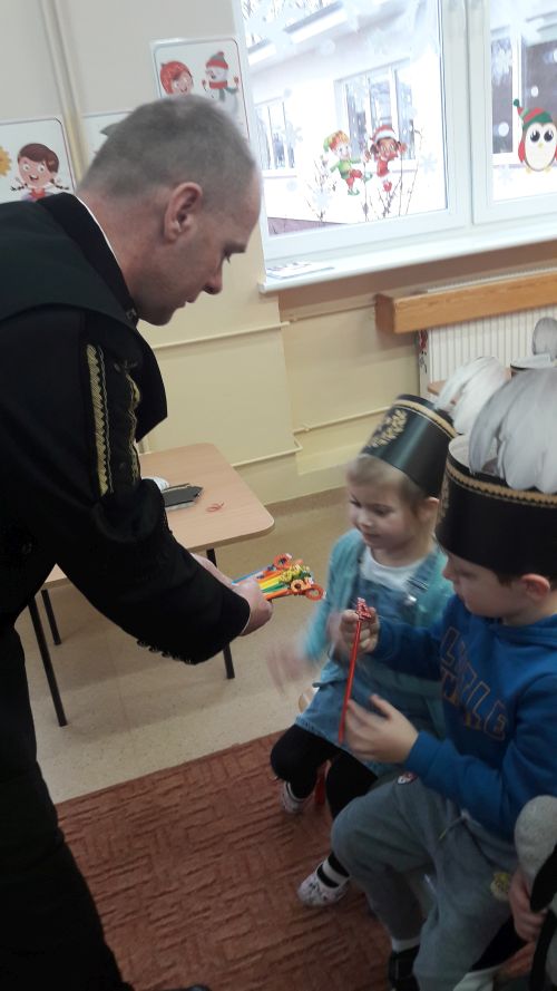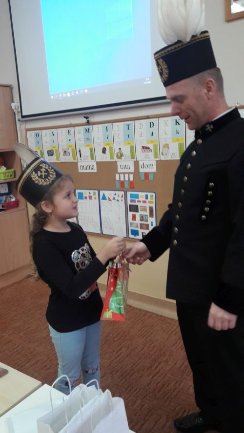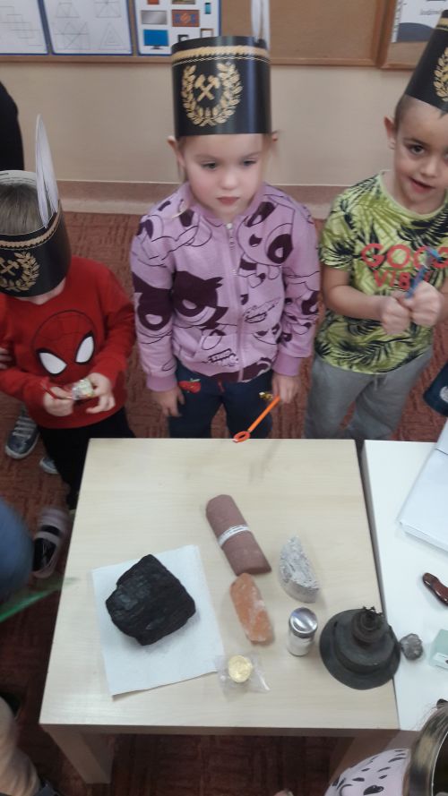 Dzieci wspólnie przeliczały guziki znajdujące się w mundurze , których jest 29- dokładnie tyle , ile lat żyła św. Barbara. Pan Łukasz opowiedział zebranym o swojej odpowiedzialnej i ważnej pracy. Pokazał wychowankom próbki zawierające różne kopaliny: węgiel, siarkę, sól, wapń, złoto. Dzieci otrzymały czapkę –czako, pamiątkowe ołówki , żelki i kolorowanki. Spotkanie upłynęło w miłej i serdecznej atmosferze. Przedszkolaki chętnie pozowały do pamiątkowych zdjęć z wyjątkowym gościem. Podziękowały panu Łukaszowi za przybycie i zaprosiły na następny rok.