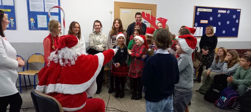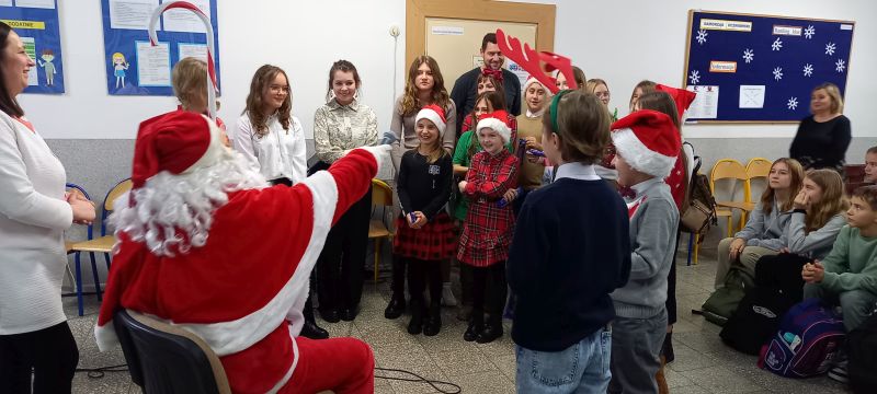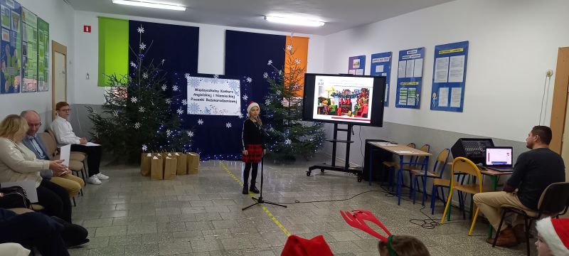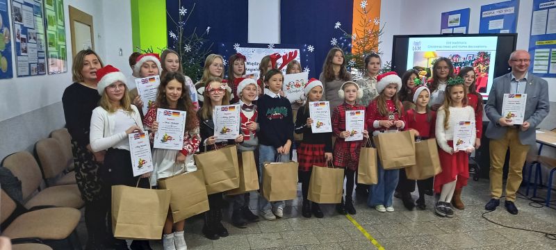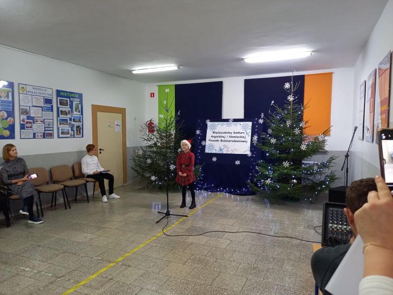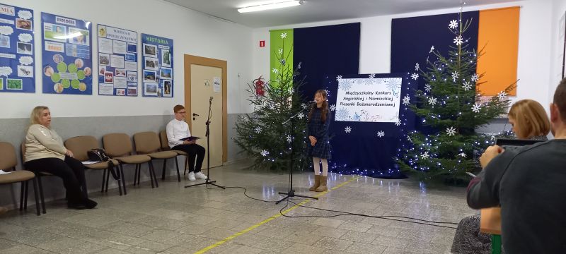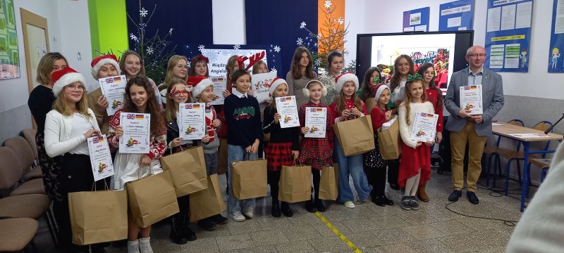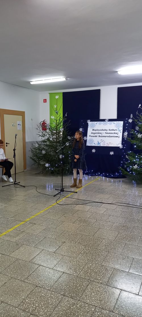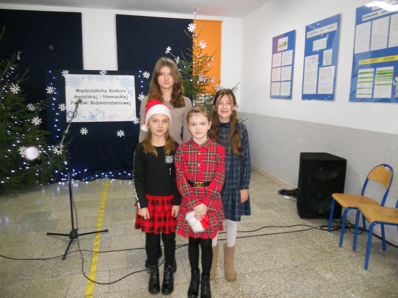 Celem konkursu były: prezentacja umiejętności językowych, wokalnych i artystycznych uczniów, propagowanie nauki języka angielskiego/ niemieckiego przez śpiew oraz kształcenie postaw czynnego uczestnictwa w kulturze. W konkursie uczestniczyli soliści w trzech kategoriach wiekowych, przy czym najliczniej reprezentowana była w tym roku kategoria klas IV - VI. Wykonano tu dwanaście piosenek w języku angielskim, a uczniowie prezentowali naprawdę wysoki poziom językowy i wokalny. Naszą szkołę reprezentowały: Aleksandra Strasburger z kl. II, Nikola Szewczyk z kl. III, Alicja Szydełko z kl. V i Daria Rudowicz z kl. VI. W swej kategorii wiekowej sukcesy odniosły: Nikola Szewczyk ( I miejsce za wykonanie piosenki „Jingle bells”) i Aleksandra Strasburger ( III miejsce z utworem „We wish you a Merry Christmas” ). Laureatki otrzymały dyplomy i nagrody. Miłym akcentem była również wizyta Świętego Mikołaja i upominki dla wszystkich uczestników konkursu.