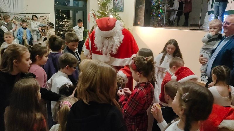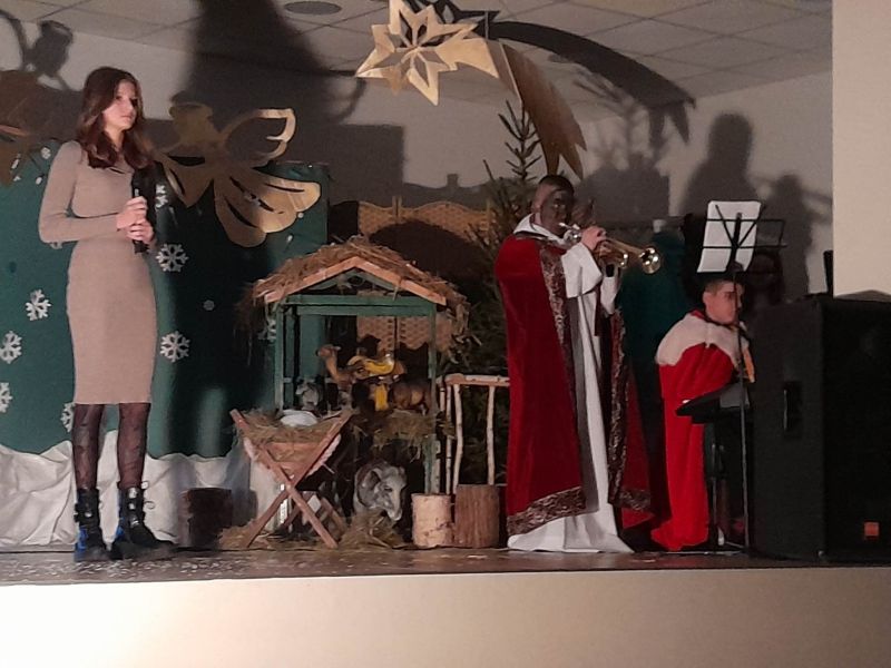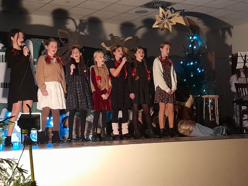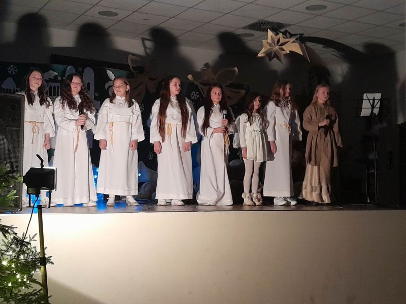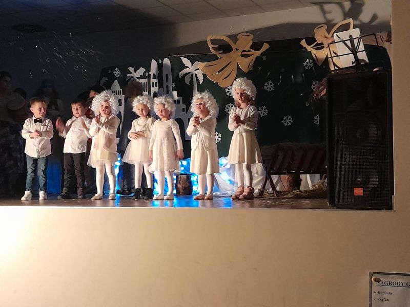 Taniec przedszkolaków z grupy „Starszaków” i piosenka w wykonaniu dzieci z grupy „Maluszków” uświetniły i rozpoczęły występy. Następnie wystawiono jasełka. Szkolni aktorzy świetnie wcielili się w swoje role, przypominając w ten sposób wydarzenia sprzed ponad dwóch tysięcy lat, kiedy to w Betlejem narodziło się Boże Dzieciątko. Uczniowie odgrywali role Maryi i Józefa, pasterzy, aniołów, trzech króli i dzieci. Przybyli oni, by złożyć pokłon Jezusowi narodzonemu w ubogiej stajence.