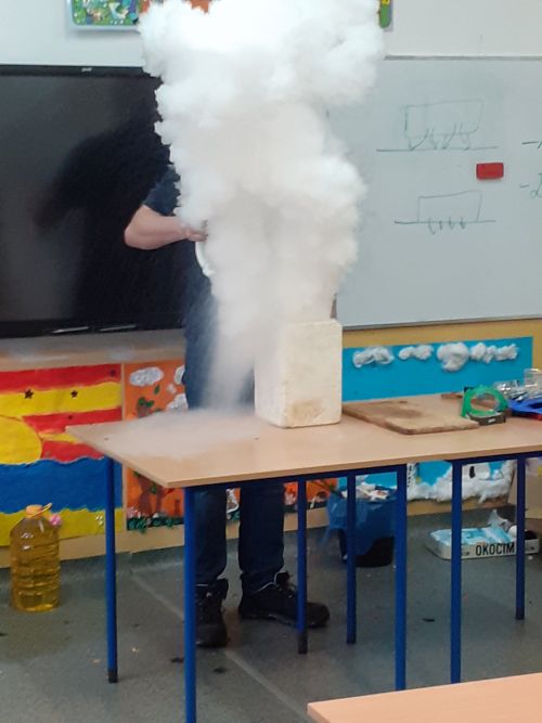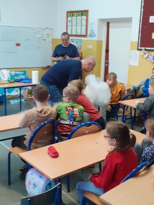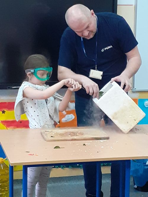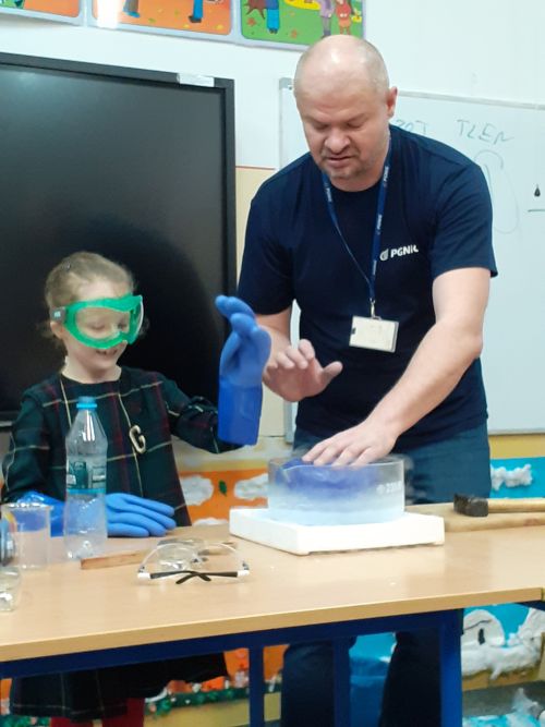 Uczniowie klas I- III wzięli udział w pełnej eksperymentów i doświadczeń lekcji pokazowej. Lekcja odbyła się w ramach serii zajęć organizowanych przez PGNiG w Odolanowie wykorzystując ciekły azot.