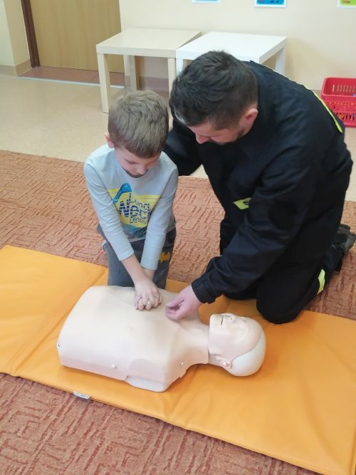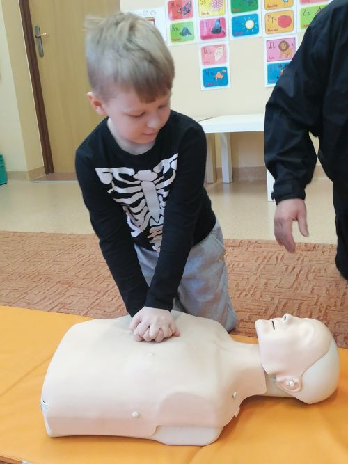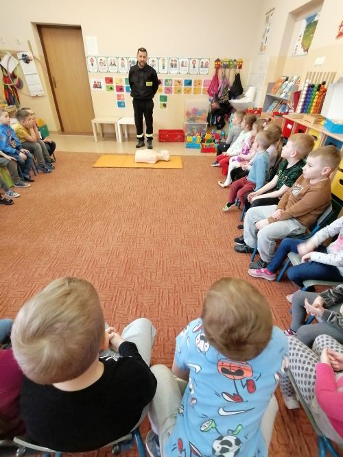 Celem spotkania było przygotowanie przedszkolaków do wykonywania prostych czynności z zakresu udzielania pierwszej pomocy oraz prawidłowego zachowania się w sytuacjach zagrożenia życia lub zdrowia. Dzieci dowiedziały się , co należy robić w przypadku zadrapania, skaleczenia lub złamania nogi. Uczyły się, jak należy sprawdzać przytomność osoby poszkodowanej i w jaki sposób można komuś pomóc zanim przyjedzie pogotowie ratunkowe. Poznały podstawowe zabiegi resuscytacyjne, ćwicząc na fantomie, oczywiście na miarę swoich możliwości . Ponadto przedszkolaki układały poszkodowanego w pozycji ustalonej bocznej . Pan Radek pochwalił dzieci za aktywność, wiedzę i umiejętności. Na zakończenie wizyty, gość ofiarował dzieciom książki Cecylki Knedelek „Pierwsza pomoc nie tylko dla przedszkolaków ” , zaś dzieci podziękowały Naczelnikowi za pouczające spotkanie.