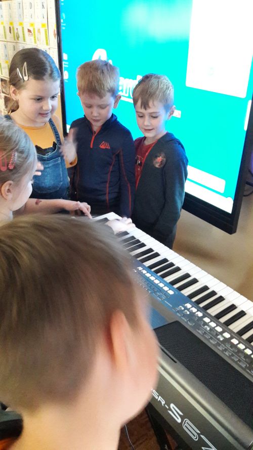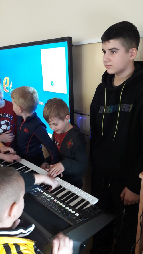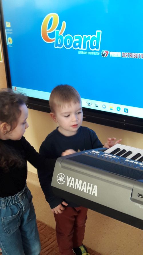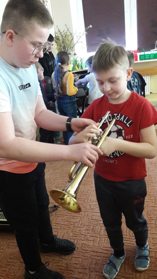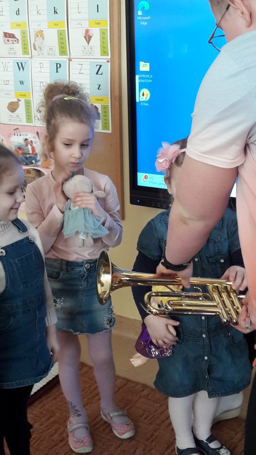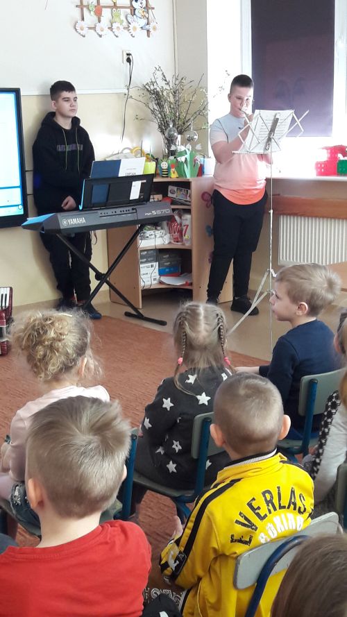 W czwartek przedszkolaki gościły muzykujących kolegów z ósmej klasy: Nikodema Kuświka oraz Piotra Pudysa. Chłopcy zaprezentowali dzieciom swoje instrumenty: trąbkę, akordeon oraz keyboard.