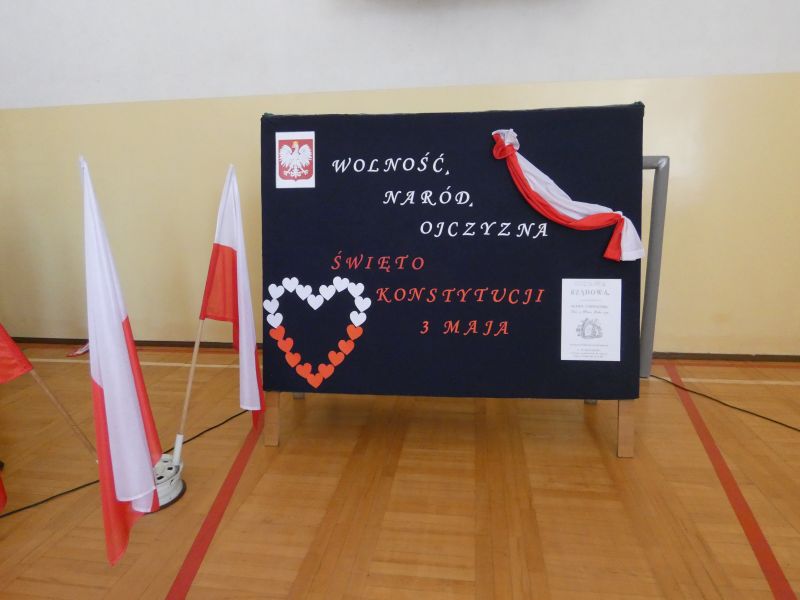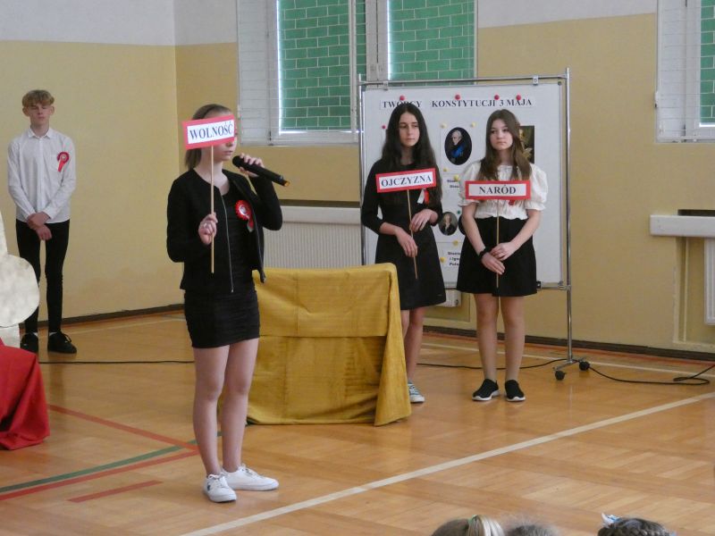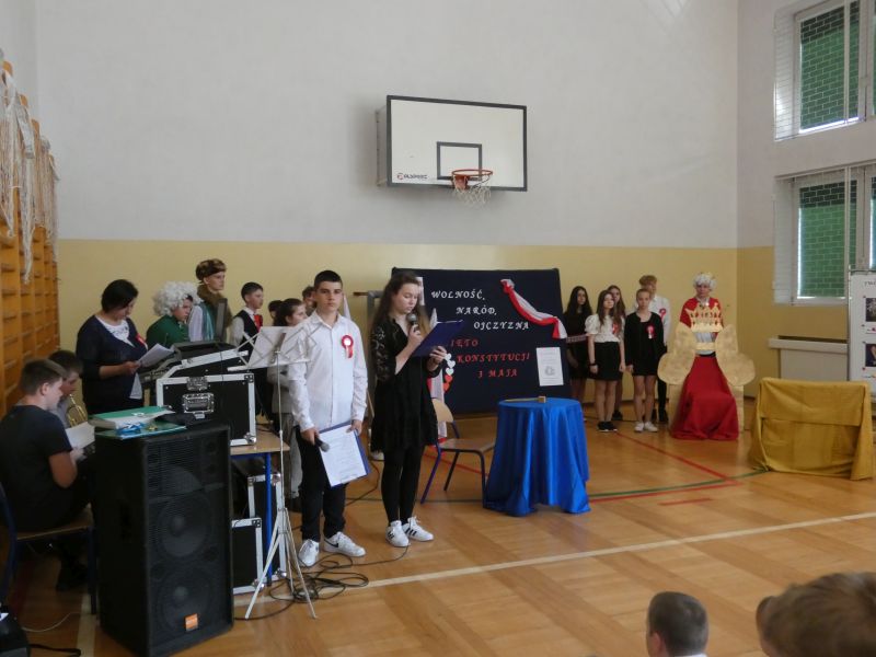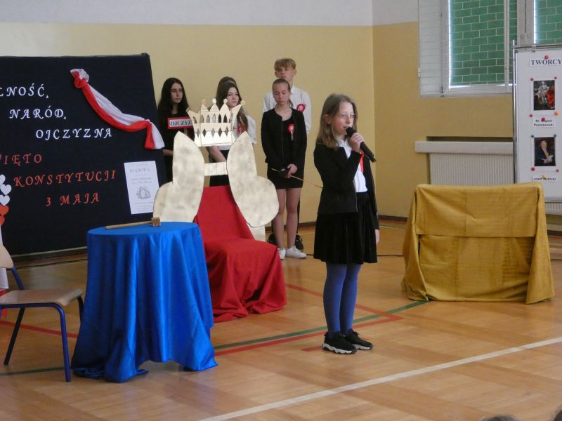 Występujący uczniowie odegrali krótkie scenki. Podczas sejmiku uczniowskiego przybliżyli historię powstania majowej Konstytucji, jej główne założenia oraz twórców. Wcielając się w role króla Stanisława Augusta Poniatowskiego, Marszałka Sejmu oraz ówczesnych posłów, młodzi aktorzy przypomnieli, co zdarzyło się 3 maja 1791 roku. Był to dzień wolności i radości. Słowa recytowanych wierszy oraz hasła: Wolność, Naród, Ojczyzna podkreśliły, jak ważne było to dla Polski wydarzenie.