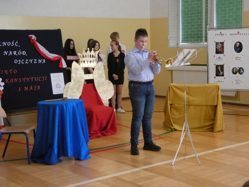 W czasie akademii wysłuchaliśmy pieśni „Witaj majowa jutrzenko”, którą zagrał na trąbce Piotr Pudys z klasy VIII. W wykonaniu Darii Rudowicz z klasy VI usłyszeliśmy przepiękny „Hymn Konstytucji 3 Maja”. Podniosły i patriotyczny charakter uroczystości podkreśliły odświętne stroje i biało-czerwone kotyliony uczniów, przedszkolaków i nauczycieli.