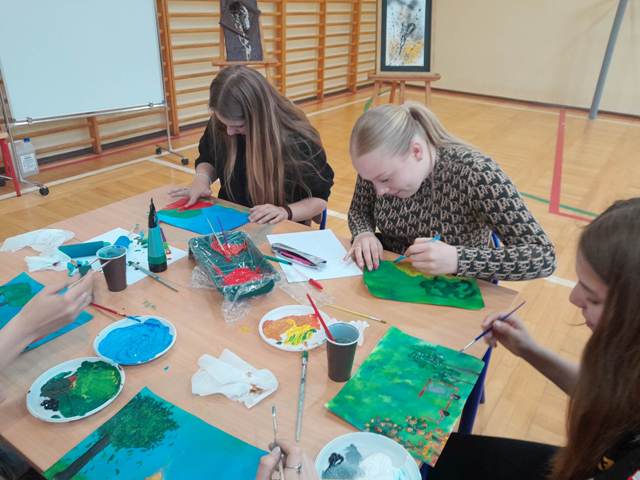 Artysta najpierw pokazał uczniom kilka swoich prac, a następnie poprosił ich o uruchomienie swojej wyobraźni i stworzenie dzieła o tematyce ekologicznej. Zajęcia te sprawiły uczniom bardzo dużo frajdy i chętnie wykonywali oni swoje zadania, a ich arcydzieła ozdobią nasz szkolny korytarz. Na koniec pan Robert zaproponował wykonanie wspólnej pracy- odciśnięcie dłoni wszystkich uczestników warsztatów na pamiątkowym płótnie.