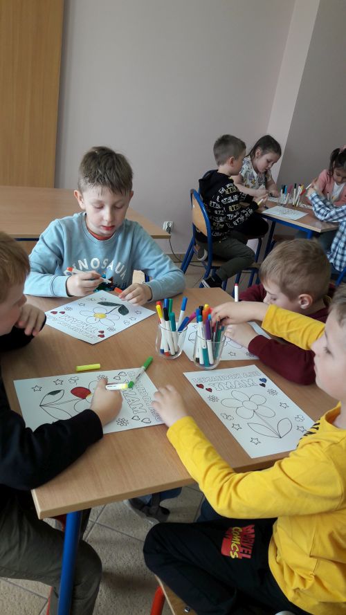 Dnia 10 maja 2023r. dzieci przedszkolne oraz chętni uczniowie klasy pierwszej i drugiej uczestniczyli w warsztatach plastycznych zorganizowanych z okazji Dnia mamy przez Gminę Sośnie.