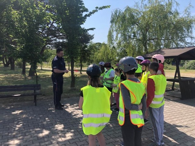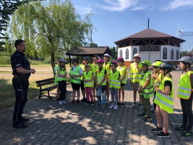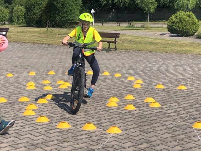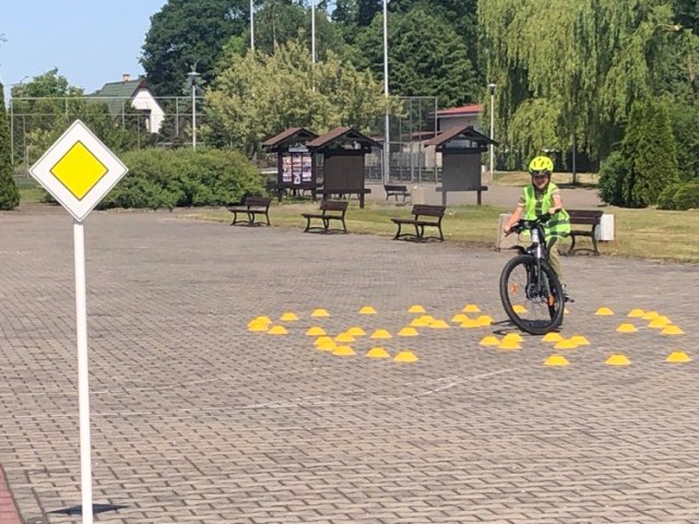 Nad bezpiecznym i sprawnym przeprowadzeniem egzaminu praktycznego czuwał Kierownik Posterunku Policji w Sośniach – asp. Damian Szewczyk. Uczniowie, poruszając się po specjalnie przygotowanym torze, musieli nie tylko stosować się do znaków i przepisów ruchu drogowego, ale również wykazać się sprawnością i opanowaniem sztuki jazdy na rowerze. Egzamin był okazją do rozmowy na temat zasad poruszania się po drogach rowerem i hulajnogą elektryczną. Pan Policjant przypomniał również dzieciom o podstawowych znakach drogowych, o prawidłowym wyposażeniu roweru oraz o potrzebie używania elementów odblaskowych i kasków ochronnych.