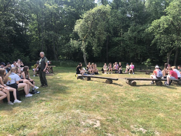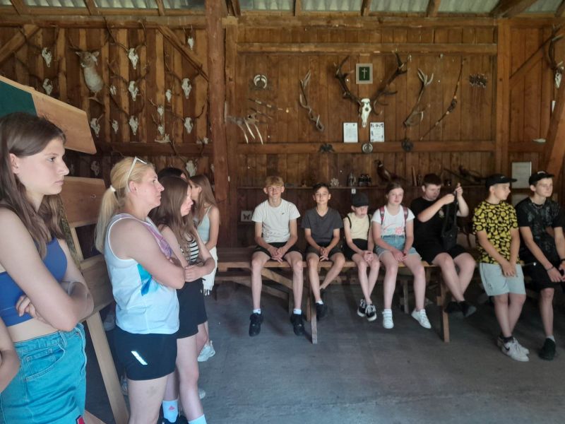 Pan leśniczy – Bronisław Krawiec oprowadził uczniów po leśniczówce i w bardzo przystępny sposób opowiedział uczniom różne ciekawostki na temat lasu i jego mieszkańców. Młodzież miała również okazję podziwiać stodołę, w której mieszczą się różne trofea Pana Bronisława, m.in. poroża różnych zwierząt.