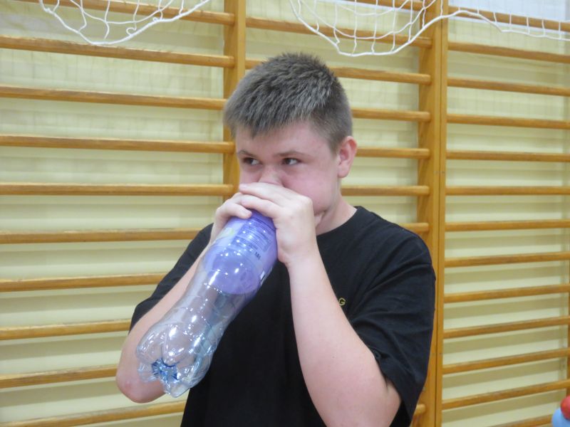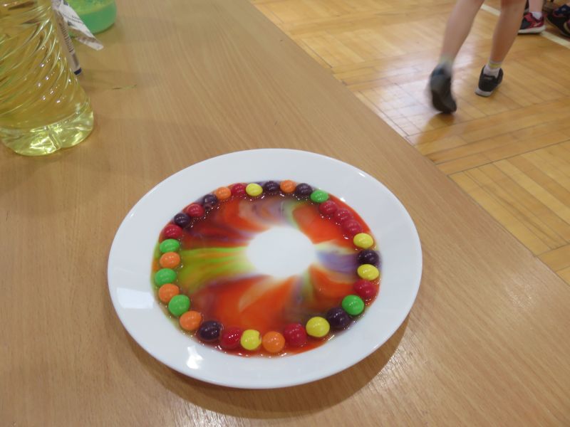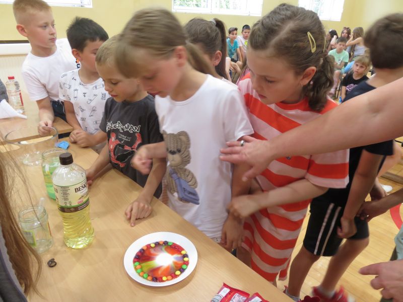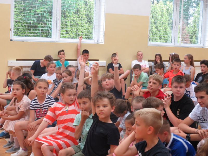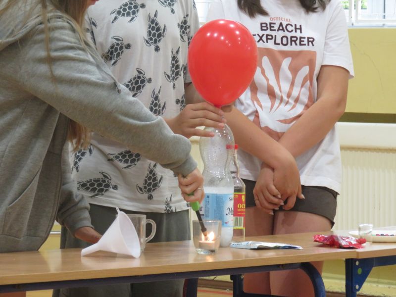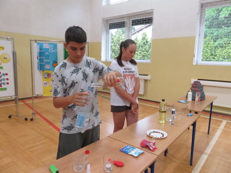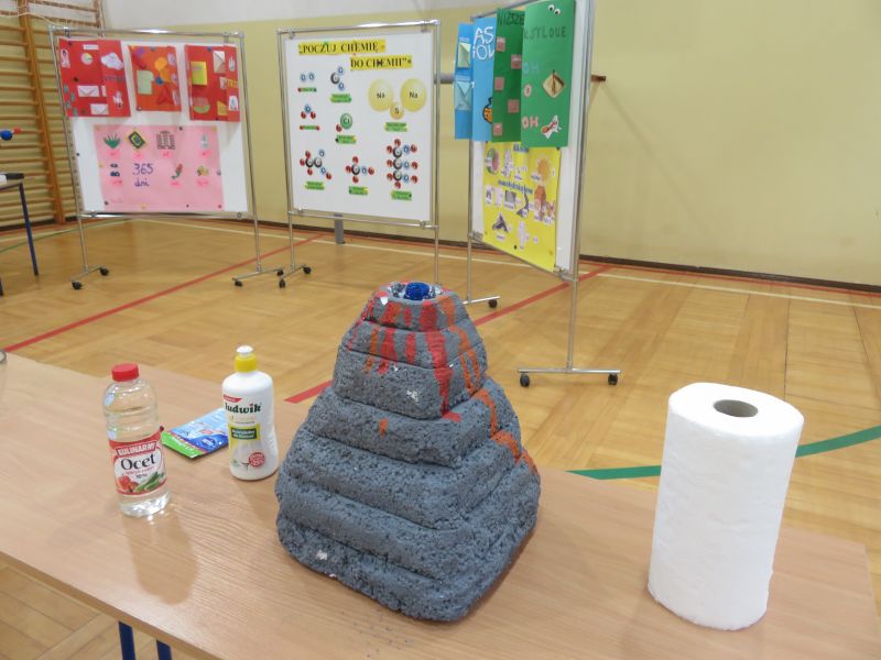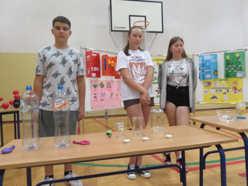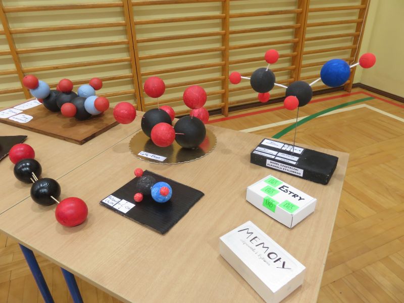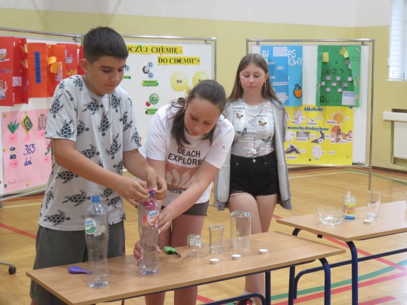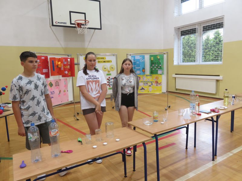 W sali gimnastycznej ósmoklasiści przygotowali wystawę prac, które były wynikiem podjętych przez nich działań. Uczniowie wykonali modele cząsteczek różnych związków chemicznych poznanych na lekcji, gry dydaktyczne, plakaty i lapbooki. Zorganizowali również dla młodszych kolegów i koleżanek pokaz doświadczeń chemicznych. Dzieci dowiedziały się wielu interesujących rzeczy, np. jak można nadmuchać balon bez pomocy ust. Z wielką uwagą i zainteresowaniem obserwowały pokaz eksperymentów oraz odpowiadały na pytania starszych kolegów. Było to dla nich ciekawe przeżycie. Na zakończenie chętni uczniowie uczestniczyli w quizie sprawdzającym podstawową wiedzę przyrodniczą.