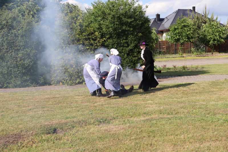 O godzinie 17.00 rozpoczął się spektakl historyczny. Dziewczęta i chłopcy naszej szkoły przedstawili fragment rekonstrukcji „Bitwy o Granowiec” przygotowanej pod kierunkiem pana Bartosza Lisiaka – rekonstruktora z Ostrowa Wielkopolskiego. Bohaterowie, w specjalnie dobranych strojach i za pomocą artefaktów wytworzonych współcześnie, wiernie odtworzyli koloryt tamtych czasów. Widowisko było dla wszystkich żywą lekcją historii.