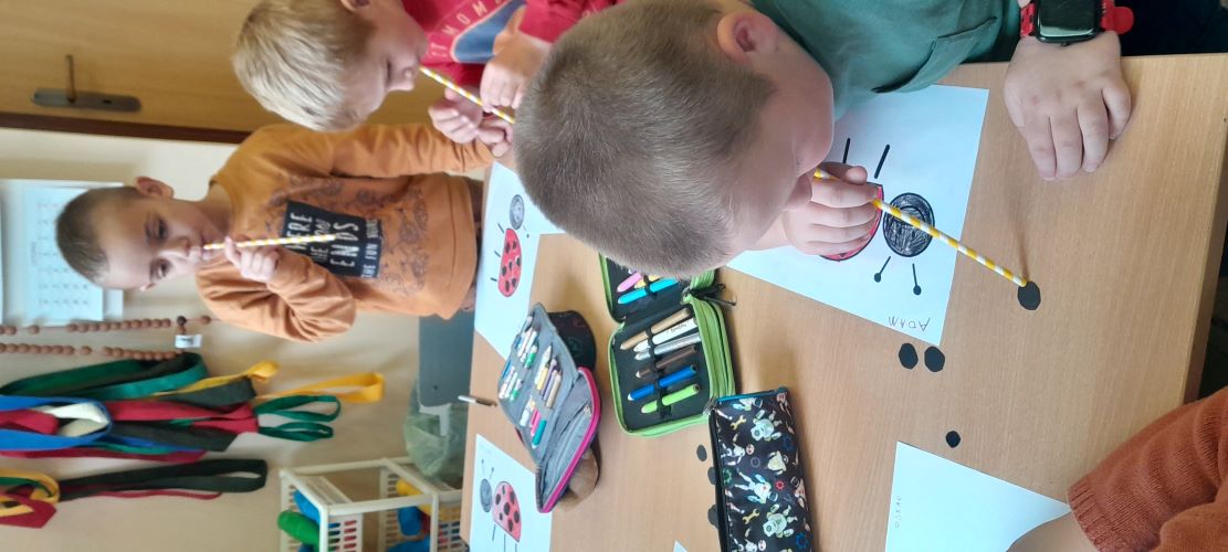 Zadanie nr 2 pt.: „B – Biedronka” polegało na przenoszeniu kółek-kropek za pomocą powietrza wdychanego/wciąganego przez słomkę.
