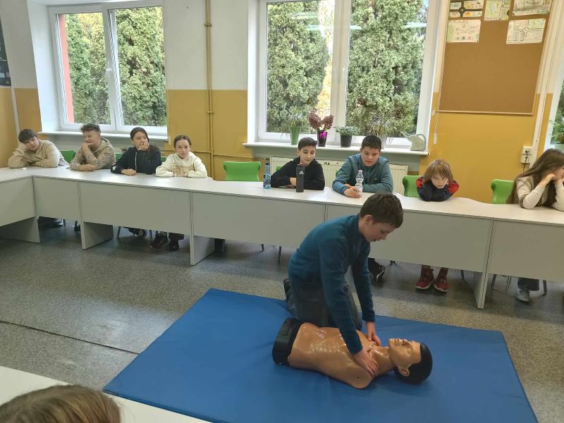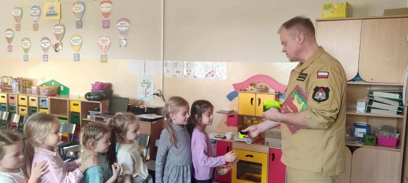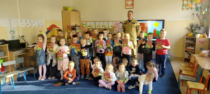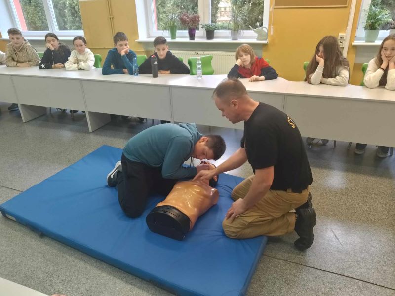 Dla uczniów klasy VI i VII poprowadzili oni warsztaty z zakresu szeroko pojętej prewencji społecznej, a także z zakresu udzielania pierwszej pomocy. Młodzież bardzo chętnie uczestniczyła w zajęciach, ćwicząc praktyczne umiejętności w zakresie resuscytacji krążeniowo – oddechowej, układanie poszkodowanego w pozycji bocznej ustalonej, czy postępowania przy zakrztuszeniach. Pan Tomasz opowiedział też o trudach i codzienności pracy strażaka, a także o ścieżce edukacyjnej prowadzącej do tego zawodu. Następnie strażacy odwiedzili naszych najmłodszych milusińskich, czyli przedszkolaków. Podczas tego spotkania dzieci dowiedziały się pod jaki numer trzeba zadzwonić, gdy zobaczą pożar lub duże zadymienie, jak zachować się podczas ewakuacji i dlaczego dzieci nie powinny bawić się zapałkami. A wszystko to dzięki dwuodcinkowemu programowi pt. „Florka na straży bezpieczeństwa”.