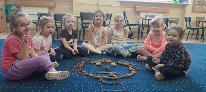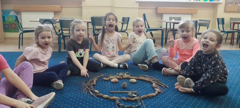 Zadanie nr 5 pt.: „E – Eko-logopedia”. Dzieci z przyniesionych wcześniej ekologicznych materiałów tworzyły buźki.