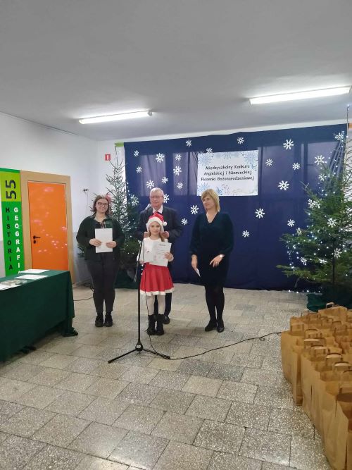 Celem konkursu były: prezentacja umiejętności językowych, wokalnych i artystycznych uczniów, propagowanie nauki języka angielskiego/ niemieckiego przez śpiew oraz kształcenie postaw czynnego uczestnictwa w kulturze. Jak co roku, nasza szkoła też wzięła w nim udział, a reprezentowały nas uczennice: Nikola Szewczyk w utworze „Marry, did you know?”, Klaudia Rudowicz – „Merry Christmas everyone”, Liliana Wójcik – „Last Christmas” i Daria Rudowicz – „Snowman”. Wszystkie występy były cudowne, a konkurencja ogromna. Popisy młodych artystów wprawiły publiczność w świąteczny nastrój, a naszym solistkom udało się zdobyć nagrody: