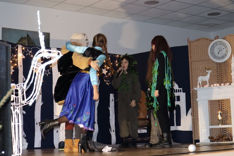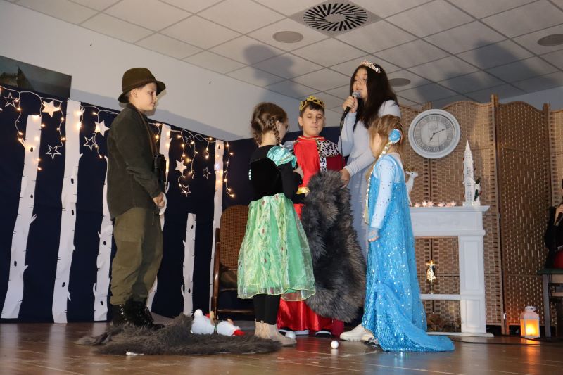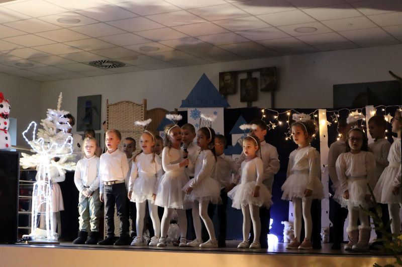 W nastrój zbliżających się świąt Bożego Narodzenia wprowadziły nas występy przedszkolaków, które zaśpiewały piosenkę „Pani Zima” oraz wykonały przepiękny układ taneczny do utworu „Noel”. Ten świąteczny czas umilił nam również nasz absolwent – Piotr Pudys, który grą na trąbce wykonał kilka kolęd. Tegoroczne „Święta z kulturą” uświetnił występ naszych uczniów, którzy wystawili spektakl pt.: „W krainie lodu”. Został on przygotowany przez koło teatralne pod kierunkiem pani Anety Wiei i przy pomocy pani Grażyny Gąbki. Śledząc losy Elsy i Anny można było wprowadzić zgromadzonych na sali w świat najważniejszych dla człowieka wartości w życiu, takich jak: miłość, przyjaźń, dobro i życzliwość. Puentą tegoż przedstawienia były słowa Olafa, który powiedział: Tylko wielka miłość może rozpuścić lód w sercu.
