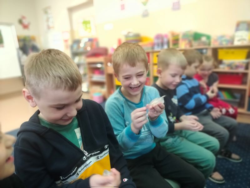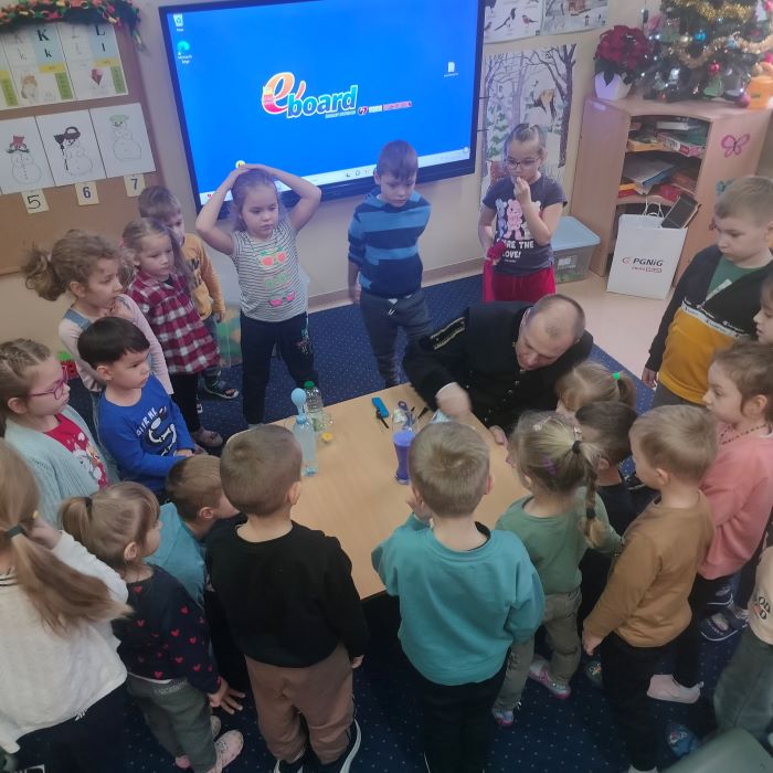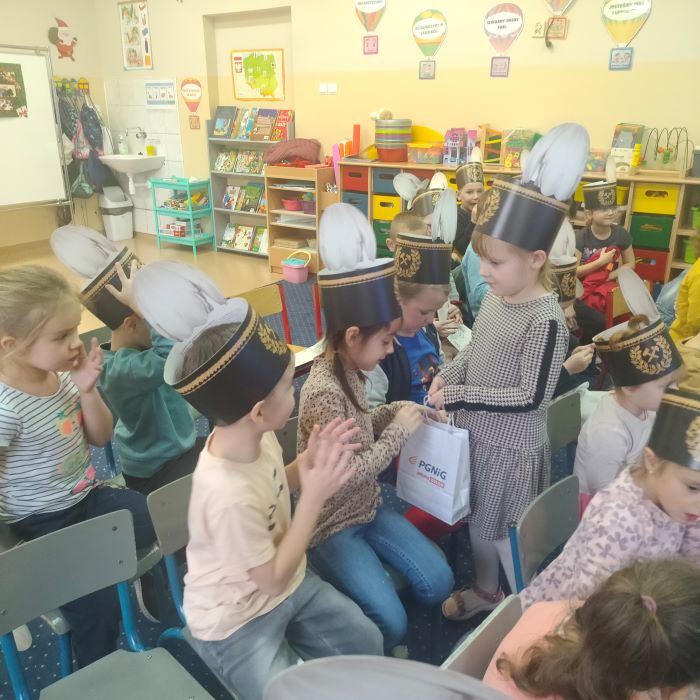 Przedstawił dzieciom przepiękną historię o Świętej Barbarze- patronce górników. Przedszkolaki dowiedziały się również, że górnicy wydobywają nie tylko węgiel, ale i ropę naftową. Podczas spotkania przedszkolaki miały okazję zobaczyć jak wygląda górniczy strój galowy. Wspólnie liczyły, ile guzików posiada mundur naszego gościa. Ponadto Pan Łukasz pokazał, w jaki sposób działa lampa naftowa oraz przeprowadził wiele ciekawych doświadczeń. Każdy przedszkolak mógł zobaczyć jak wygląda węgiel, sól, siarka itp. Na zakończenie spotkania każde dziecko na pamiątkę otrzymało czapkę górniczą, zawieszkę dinozaura oraz słodkości, za które bardzo dziękujemy.