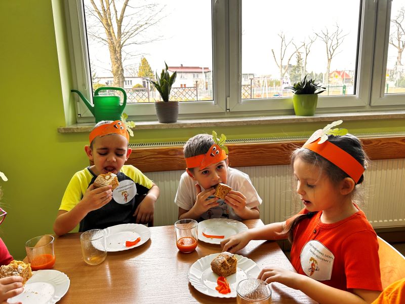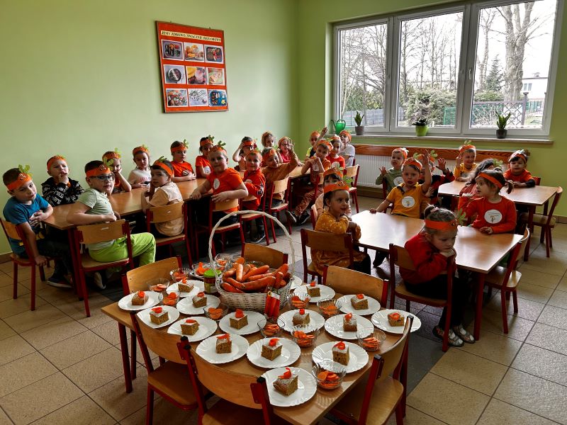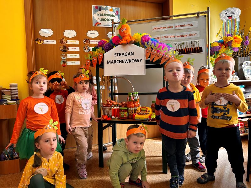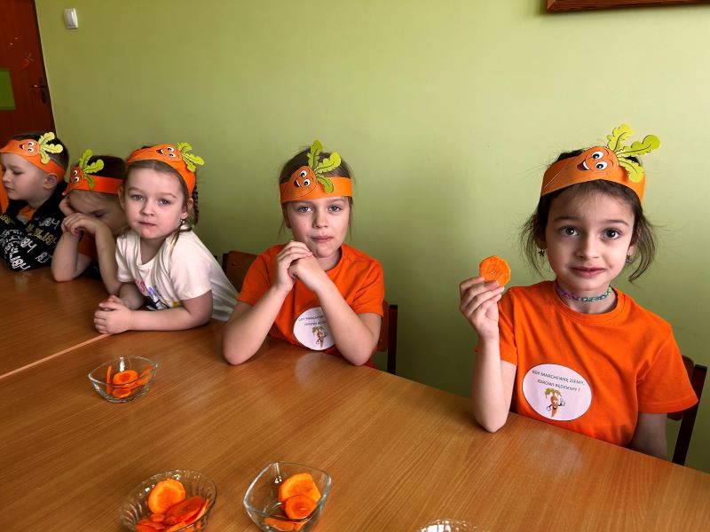 Wszyscy ubrani byliśmy na pomarańczowo, a na głowach wychowanków widniały marchewkowe opaski. Każde dziecko, wchodzące do sali, wkładało przyniesioną marchewkę do specjalnego koszyka mieszczącego się na warzywnym straganie. Po zapoznaniu się z właściwościami odżywczymi marchewki odbyła się jej degustacja: chrupanie surowego warzywka, picie soku , objadanie się ciastem marchewkowym. Śmiechu i zabawy było co niemiara - ale o to właśnie chodziło, żeby ten dzień był wyjątkowy inny od wszystkich - marchewkowy - zakręcony. Po takiej dawce witamin, śmiechu i zabawy na pewno wszystkie przedszkolaki będą zdrowe, piękne i uśmiechnięte.