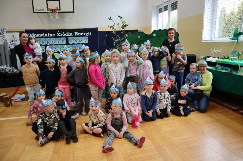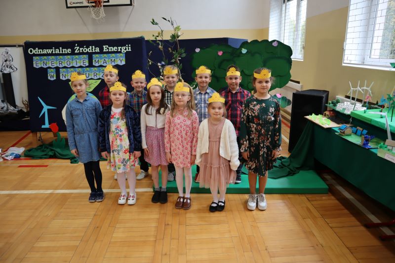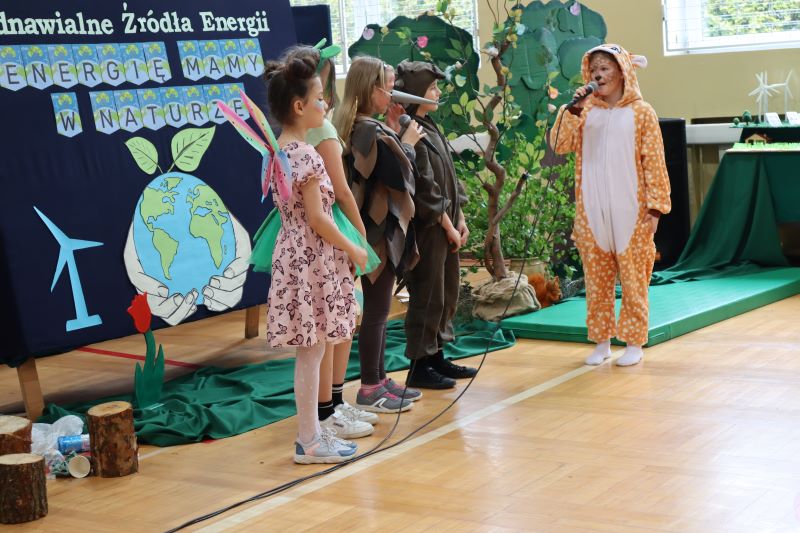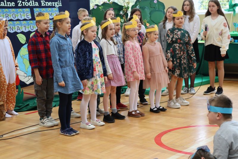 Tego zadania podjęły się w naszej szkole dzieci z pierwszej, trzeciej i czwartej klasy. Poprzez wiersze, rymowanki, piosenki oraz scenki w lesie i w mieście zaznaczyły rolę ochrony przyrody przez każdego z nas. Była to także świetna okazja do promocji działań w ramach projektu, w którym wzięła udział nasza szkoła - „Eko pracownia – zielone serce szkoły”. Uczniowie przedstawili zgromadzonym korzyści jakie płyną z alternatywnych i odnawialnych źródeł energii. Opowiedzieli także w jakiś sposób można wykorzystać OZE w domowym gospodarstwie. Akcję uświetniły ciekawe dekoracje zanieczyszczonego miasta i zielonego lasu oraz makiety przedstawiające ekologiczne gospodarstwa domowe z elementami OZE. Poza tym dzieci z klas młodszych i przedszkola miały na sobie opaski z emblematami odnawialnych źródeł energii : słońca, wiatru i wody. Pamiętajmy, że Ziemia to nasz dom i musimy o nią wspólnie dbać.