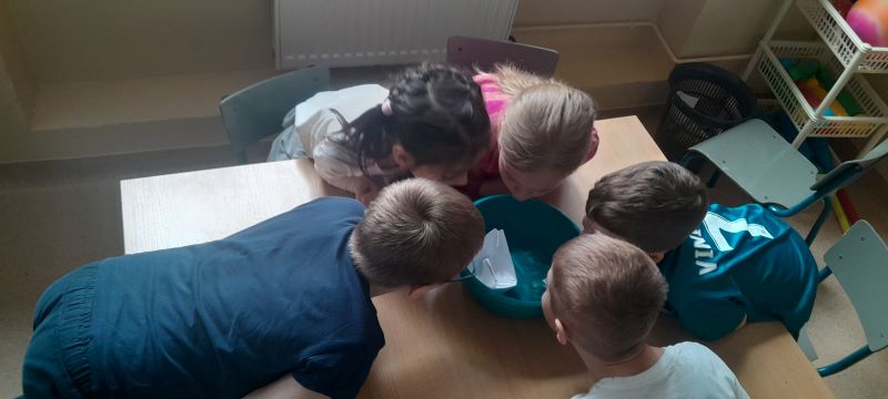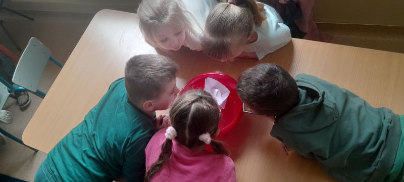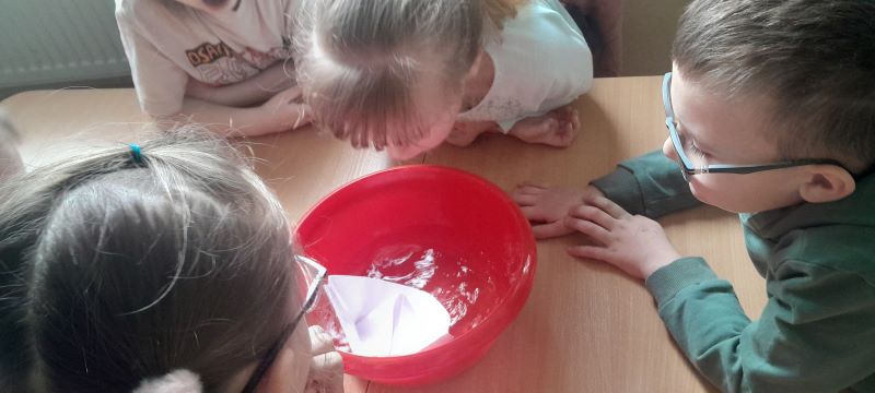 Zadanie nr 13 – „Ł – jak łódki”. Ćwiczenie poprzedziło wykonanie łódek z papieru. Przygotowane łódki umieściliśmy na wodzie w miskach. Zadaniem dzieci było wprawianie ich w ruch za pomocą wydychanego powietrza.