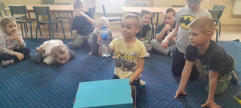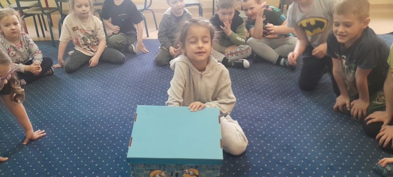 Zadanie nr 14 – „M – jak magiczne pudełko”. Zadanie dzieci polegało na wylosowaniu jednej rzeczy z przygotowanego wcześniej pudełka, w którym umieszczone zostały różne przedmioty i zaprezentowanie odgłosu wydawanego przez tą rzecz. Np. nożyczki-ciach, ciach; owoc-mniam, mniam; konik – kląskanie.