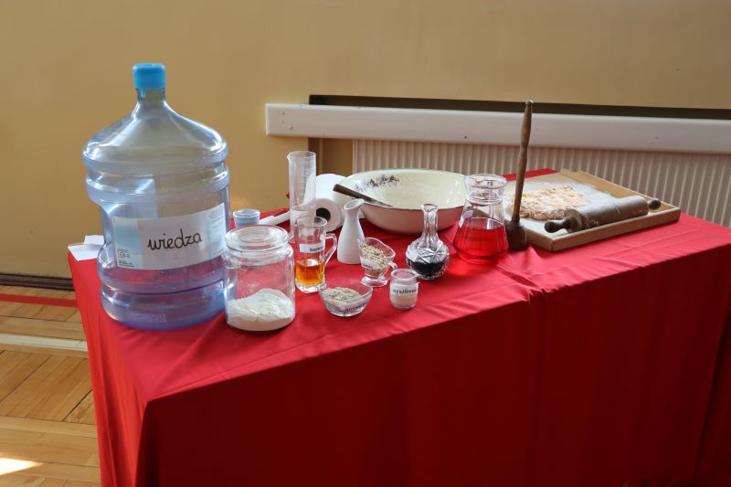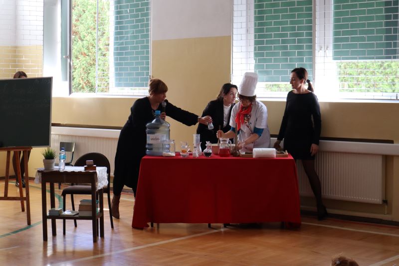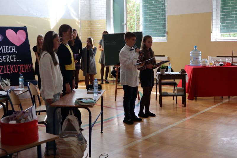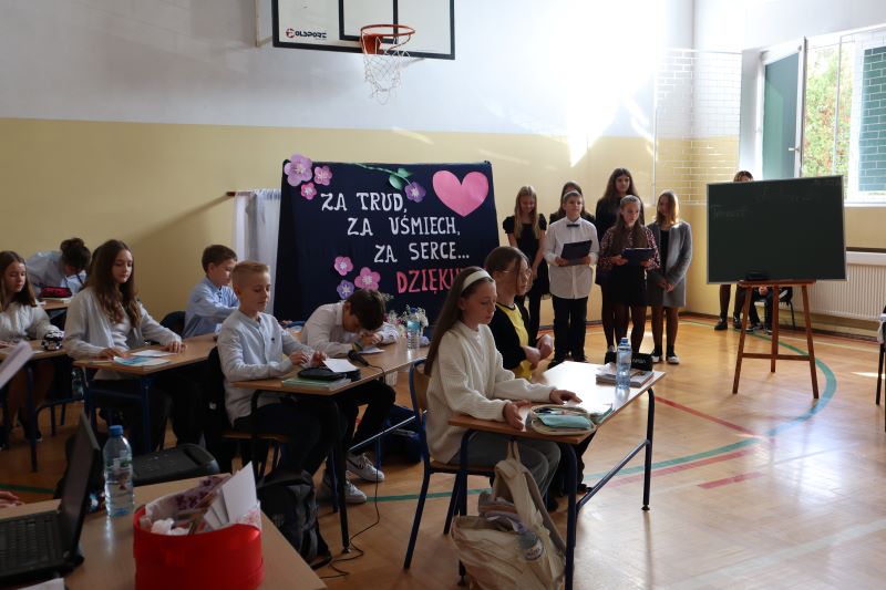 W części artystycznej dzieci i młodzież podziękowali nauczycielom za ich trud, cierpliwość, uśmiech, dobre serca i poświęcony czas. Słowami wierszy i piosenek wyrazili wdzięczność za ich codzienną pracę. Przedstawili też zabawne sytuacje z życia szkoły pt. „Parodia dnia szkolnego”, wcielając się w role nauczycieli i uczniów. W świetny nastrój wprowadziła wszystkich zebranych scenka z udziałem nauczycielek, które w dokładny sposób zaprezentowały „Przepis na ucznia”. Nie zabrakło uśmiechu i gromkich braw. Na zakończenie części artystycznej uczniowie zaśpiewali „Sto lat” i życzyli wszystkim: zdrowia, cierpliwości i wytrwałości. Przedstawiciele Samorządu Uczniowskiego, Rady Rodziców i Rady Sołeckiej wręczyli wszystkim pracownikom szkoły kwiaty. Po części oficjalnej Rada Rodziców zaprosiła pracowników szkoły i gości na wspólny poczęstunek, Dzień Edukacji Narodowej upłynął wszystkim w miłej i serdecznej atmosferze.