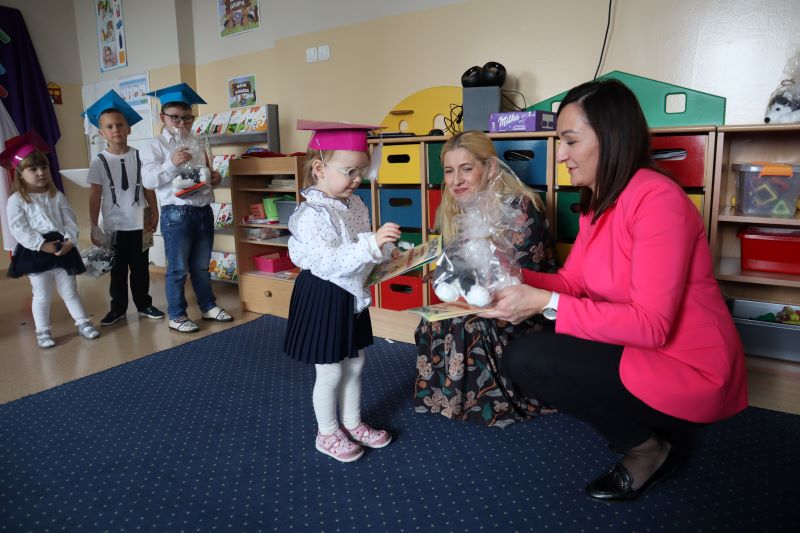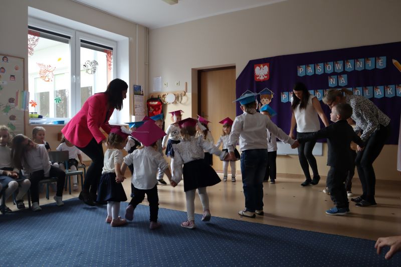 Uroczystość rozpoczęły występy dzieci z grupy „Rybek” i „Żuczków”. Mali artyści zaprezentowali przygotowane piosenki, tańce oraz wierszyki. Dla większości był to pierwszy, bardzo ważny występ. Po części artystycznej nastąpił akt pasowania, czyli dotknięcie ramienia każdego przedszkolaka ogromną kredką przez Panią Dyrektor Angelikę Kałkę. Dla przedszkolaków było to wielkie przeżycie, a dla rodziców powód do dumy i zadowolenia ze swoich pociech.