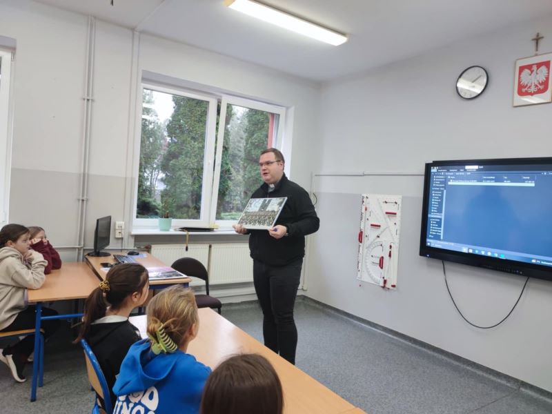 Uczestniczyli w nim uczniowie klas IV – VIII. Ks. Łukasz, po ukończeniu Gimnazjum w Granowcu, uczył się w Liceum Ogólnokształcącym nr 2 w Ostrowie Wlkp., a następnie studiował przez sześć lat w Wyższym Seminarium Duchownym w Kaliszu. W 2014 roku otrzymał święcenia kapłańskie. Jest doktorantem Instytutu Historii Kościoła na Papieskim Wydziale Teologicznym we Wrocławiu. Służył Bogu i ludziom w różnych parafiach. Uczył się też w Akademii Wojsk Lądowych im. Generała Tadeusza Kościuszki we Wrocławiu. Uzyskał stopień wojskowy porucznika. Obecnie jest ojcem duchownym w Seminarium Duchownym w Poznaniu. Jest też autorem książki pt. „Kraina Ducha Gór”. Ks. Łukasz podzielił się wspomnieniami ze szkoły. Opowiedział o swoich życiowych wyborach i szerokich zainteresowaniach. Uczniowie obejrzeli zdjęcia z ważnych życiowych wydarzeń, medale i pamiątki. Zadawali pytania, na które nasz gość chętnie odpowiadał.