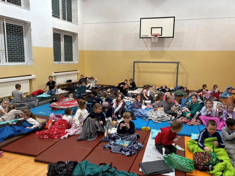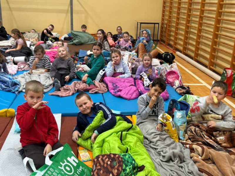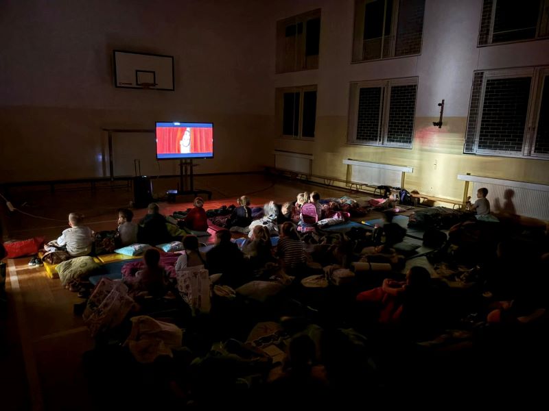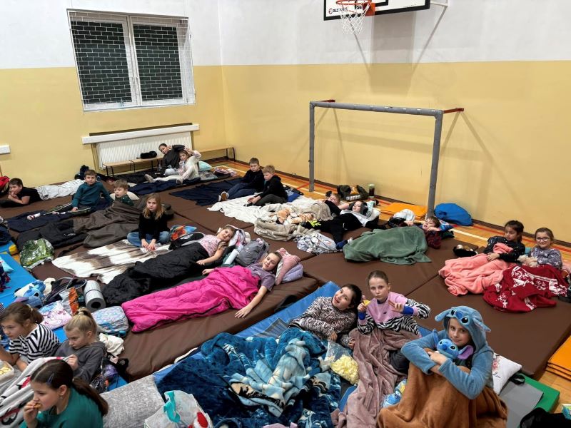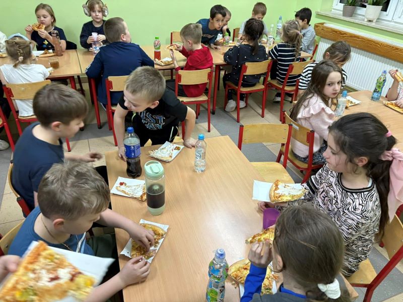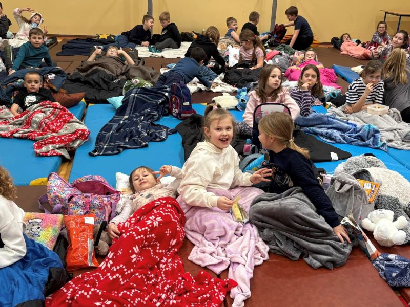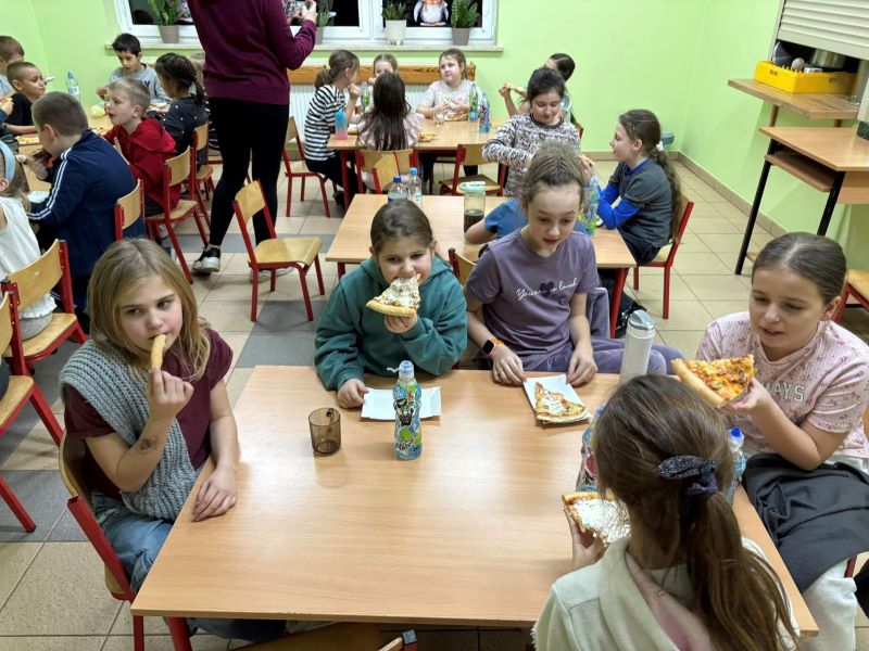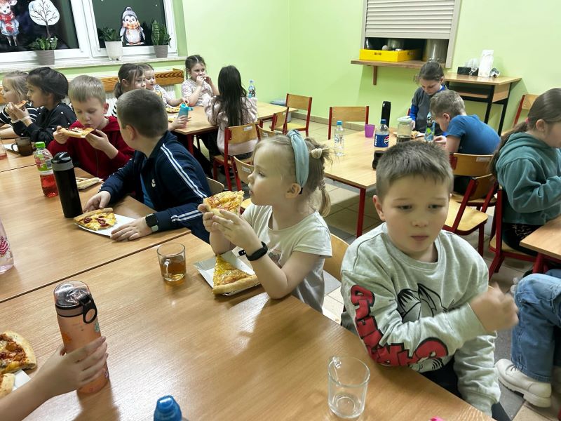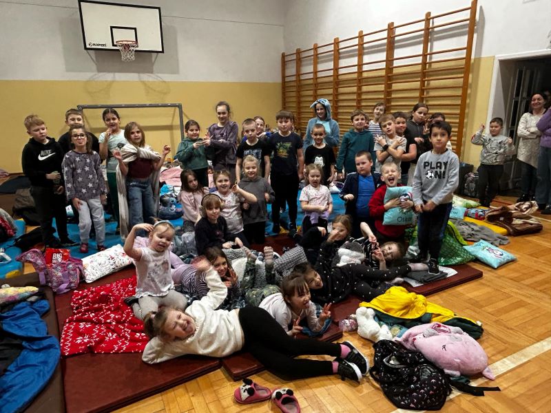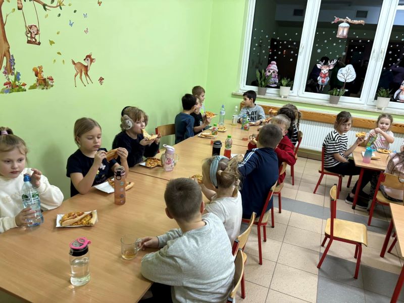 Na wygodnych materacach, zaopatrzeni w śpiwory, poduszki i koce z zainteresowaniem obejrzeli dwie animowane bajki „Tamte święta” i „Garfield”. W przerwie pomiędzy oglądanymi filmami dzieci zajadały pyszną pizzę. Było to dla nich nowe doświadczenie i niecodzienne przeżycie. Postanowiliśmy powtórzyć takie spotkanie w następne ferie.