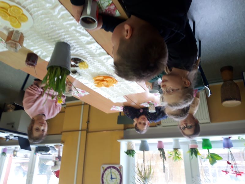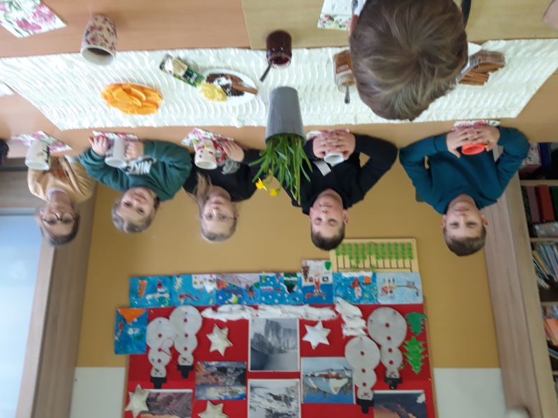 Miło i przyjemnie spędzili czas przy wspólnej herbatce uczniowie klasy II realizując temat dnia: ”Jak przygotować zimową herbatkę?” Do wybranej przez siebie herbaty dodawali według upodobań smakowych: miód, sok malinowy, świeży imbir, pomarańczę, cytrynę, goździki, cynamon, kardamon, anyż i komponowali rozgrzewającą „zimową herbatkę”. Przy okazji dowiedzieli się jakie wartości oraz jaki wpływ na nasze zdrowie i odporność posiadają te cenne dodatki. Uczniowie chętnie dzielili się zwyczajami picia herbaty w ich rodzinach oraz ulubionymi rodzajami tego wyśmienitego napoju.