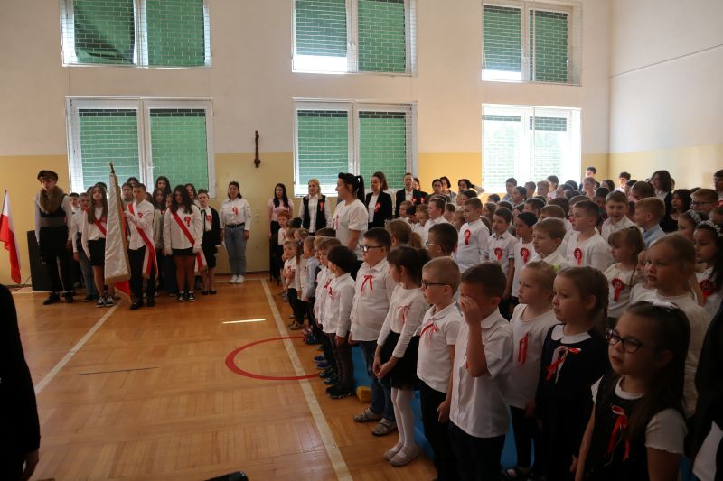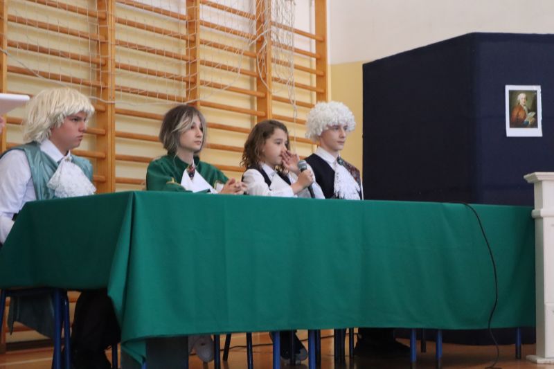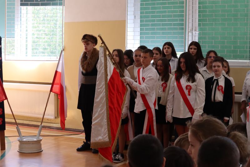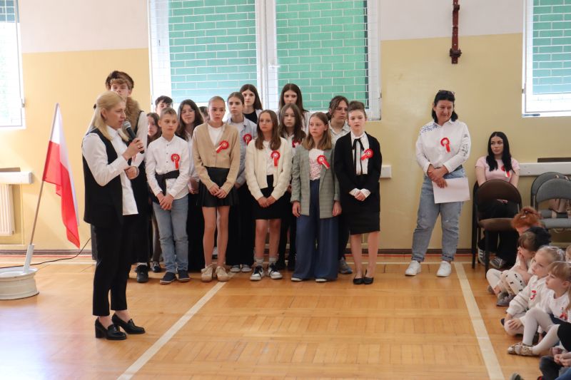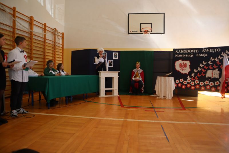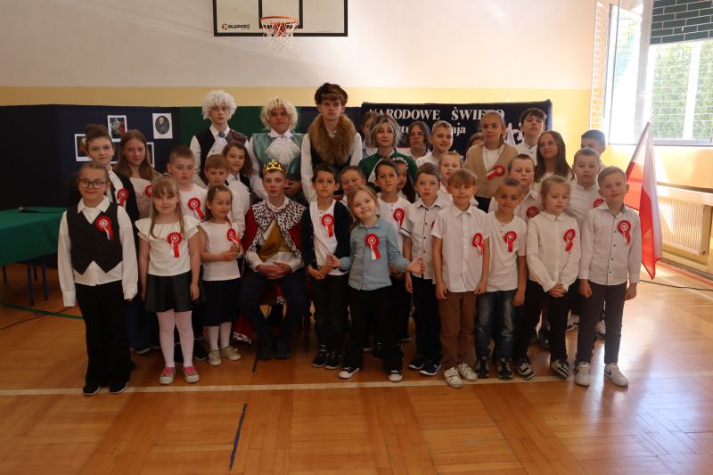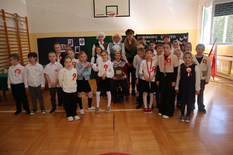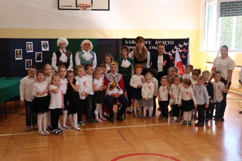 Jej celem było kształtowanie wśród uczniów poczucia przynależności narodowej. Część artystyczna rozpoczęła się od wprowadzenia sztandaru i odśpiewania hymnu państwowego. Społeczność szkolna wysłuchała montażu słowno – muzycznego oraz obejrzała scenkę historyczną nawiązującą do obrad Sejmu Czteroletniego i momentu uchwalenia Konstytucji 3 Maja. Uczniowie z pełnym zaangażowaniem wcielili się w role posłów, mieszkańców Warszawy, Marszałka Sejmu Rzeczypospolitej Polskiej - Stanisława Małachowskiego oraz króla Stanisława Augusta Poniatowskiego. Ta wyjątkowa lekcja historii skłoniła zgromadzonych do refleksji nad tym, że Ojczyzna jest naszym wspólnym dobrem, a Konstytucja 3 Maja była potwierdzeniem tej idei. Podniosły i patriotyczny charakter uroczystości podkreśliły odświętne stroje i biało-czerwone kotyliony uczniów, przedszkolaków i nauczycieli.