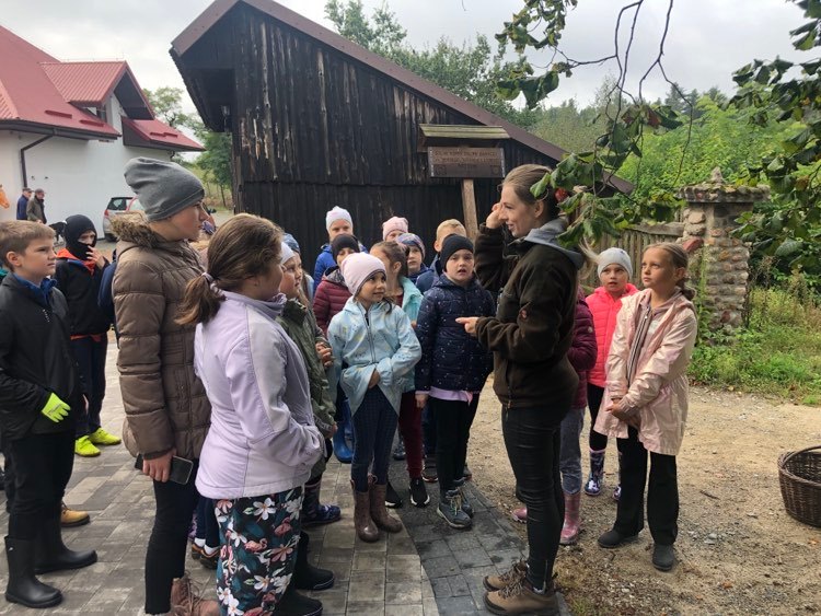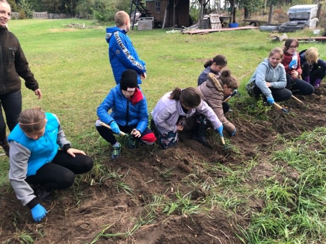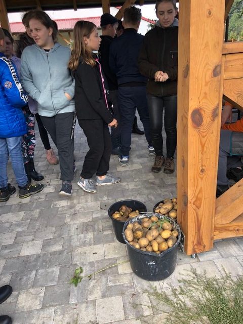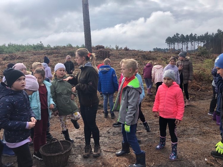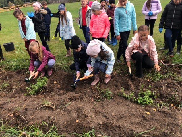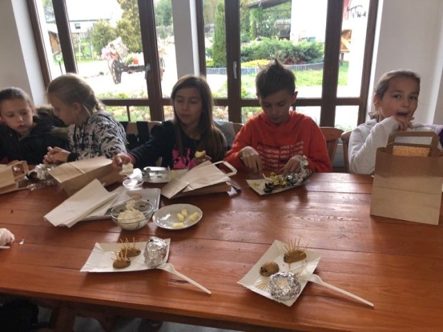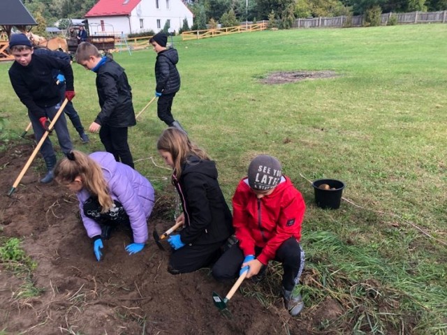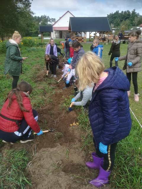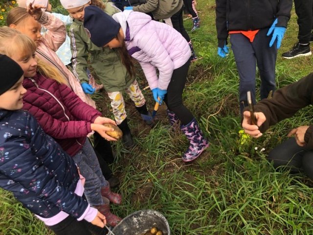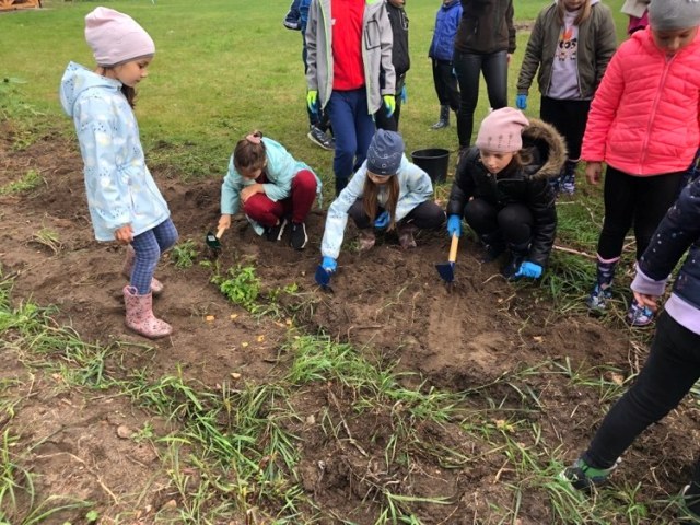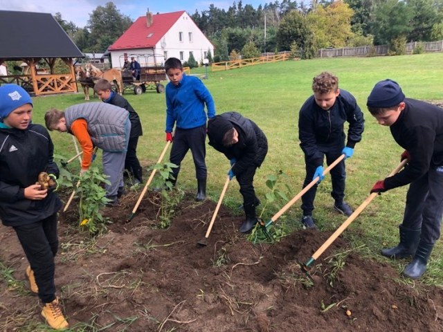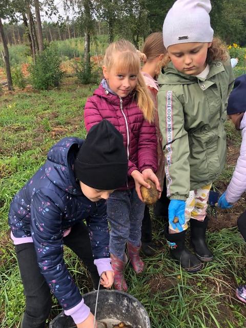 Podczas spaceru po ścieżce przyrodniczej rozpoznawali gatunki drzew i zbierali dary lasu potrzebne do tworzenia zwierzątek z ziemniaków. Następnie dzieci poznały proces uprawy ziemniaków i wyruszyły na pole, gdzie za pomocą motyki mogły je samodzielnie wykopać i pozbierać do koszyków. Po ciężkiej pracy nadszedł czas na relaks przy ognisku, do którego trafiły zbiory.