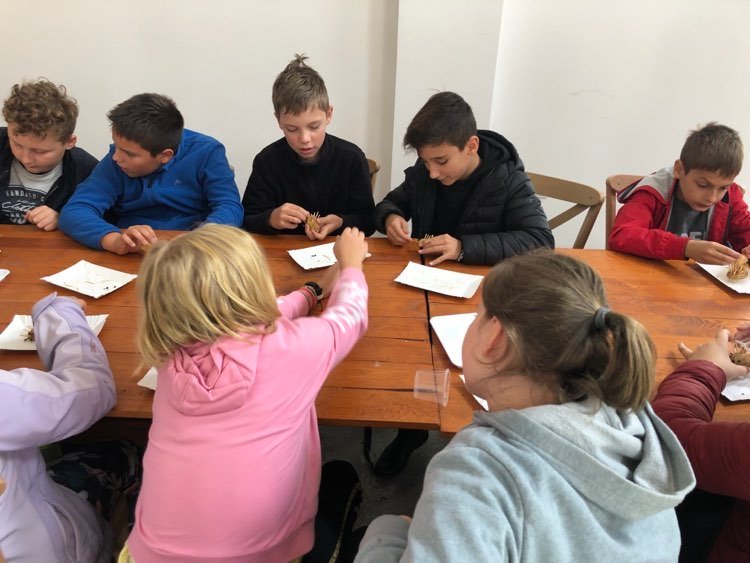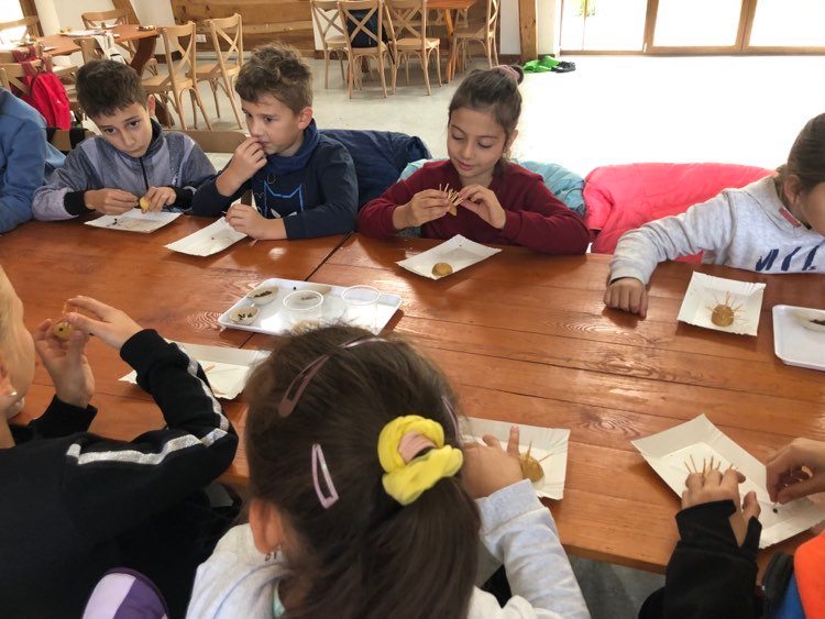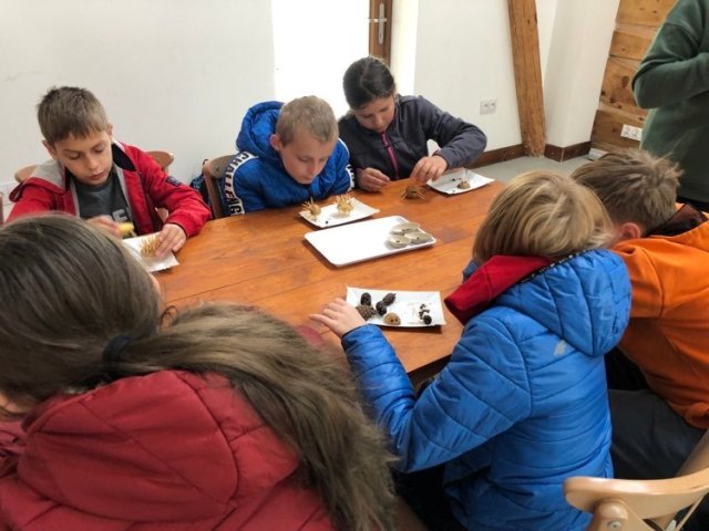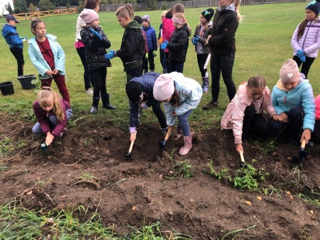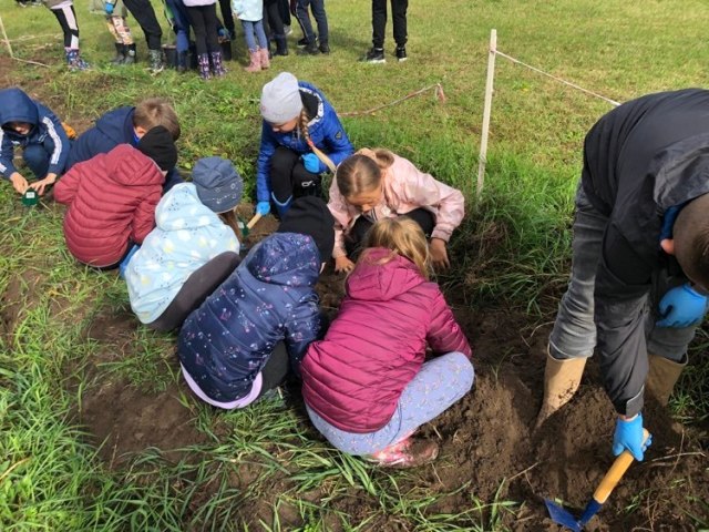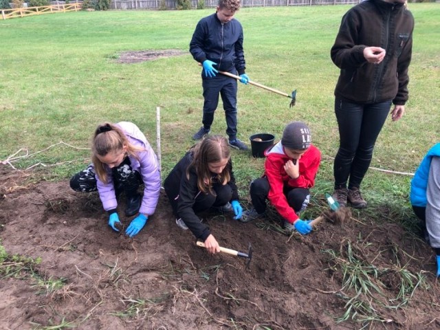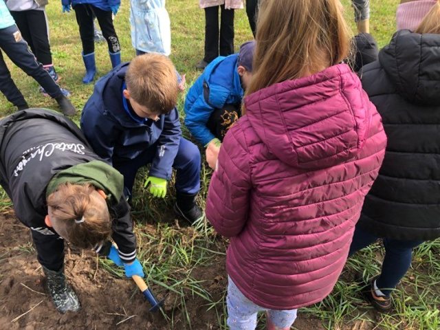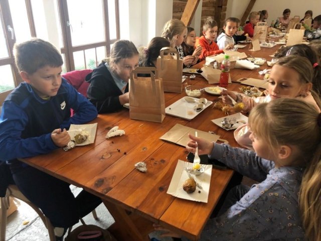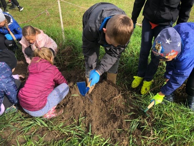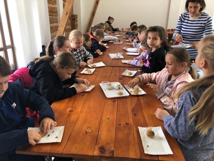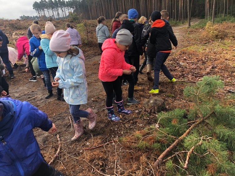 Podczas spaceru po ścieżce przyrodniczej rozpoznawali gatunki drzew i zbierali dary lasu potrzebne do tworzenia zwierzątek z ziemniaków. Następnie dzieci poznały proces uprawy ziemniaków i wyruszyły na pole, gdzie za pomocą motyki mogły je samodzielnie wykopać i pozbierać do koszyków. Po ciężkiej pracy nadszedł czas na relaks przy ognisku, do którego trafiły zbiory.