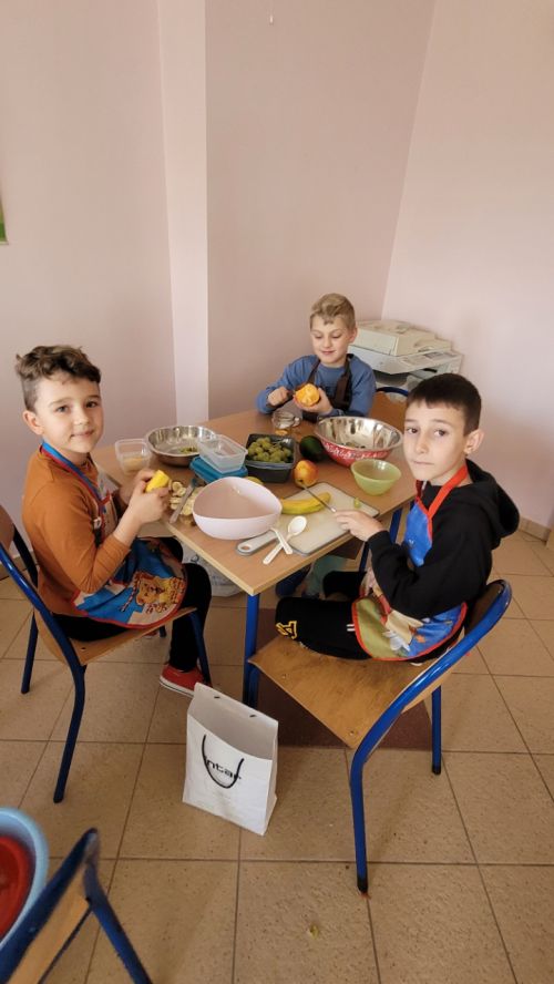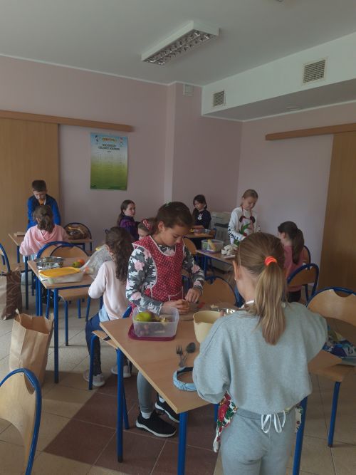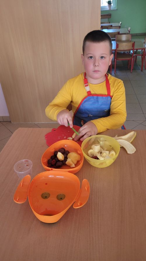 Uczniowie klas I - III przygotowali z ulubionych owoców pyszne sałatki, które zajadali z apetytem. Klasy II i III wybrały się w teren na podchody.