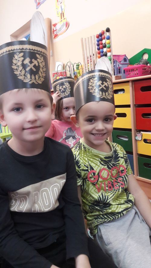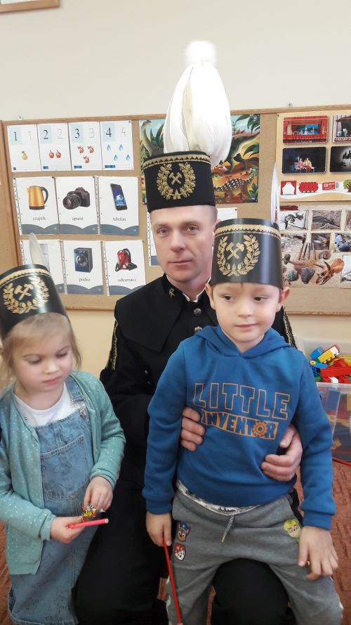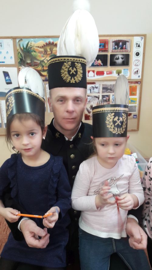 Z okazji Barbórki do przedszkola przybył tata Ulki, pan Łukasz Rapalski, który pracuje w ZZNiG. Gość zaprezentował się w galowym stroju górniczym, dzięki czemu najmłodsi mogli poznać wszystkie elementy ubioru.